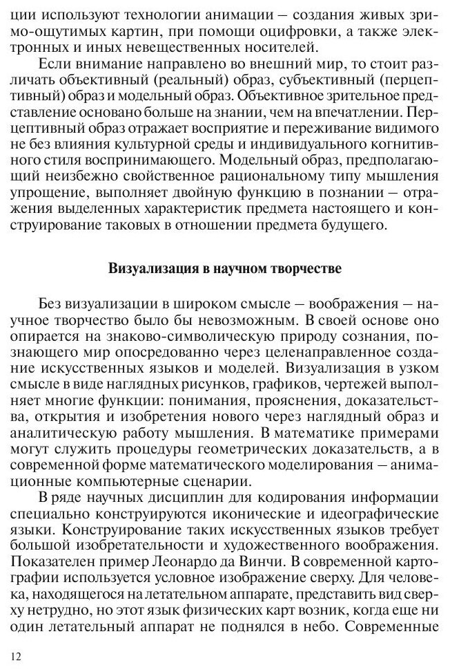 В книге представлены результаты междисциплинарных исследований проблем визуализации и образного мышления. Эпистемологи предлагают системные модели создания и восприятия зрительных образов. Обсуждение проблемы восприятия форм природы вносит вклад в синергетическую парадигму. Ряд работ посвящен анализу художественного образа в живописи, литературе, кинематографе, архитектуре. Различные точки зрения на индивидуальные, социальные, политические и культурные образные реальности представлены специалистами по психологии, антропологии, политологии, культурологии. Книга предназначена для специалистов различного профиля, интересующихся проблемами творчества.