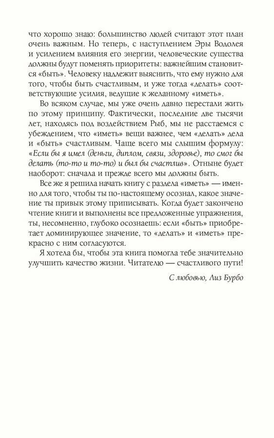 Центральная идея книг Лиз Бурбо — «доставлять (себе) удовольствие». Как принципиальная установка, она противоречит Благородной Истине Будды «Жизнь есть страдание».Страдание возникает из-за того, что я подавляю свои желания. Страдание возникает из-за того, что я хочу все контролировать. Что же получится, если мое желание заключается в том, чтобы все контролировать? Подавлять это желание?Жизнь есть страдание? Жизнь трудна? Жизнь сложна? Долой эти древние оковы! Жизнь должна быть, и может быть, и будет — простой материально, богатой духовно и полной радости, движения, гармонии. Кто же это все принесет нам на тарелочке? Не пророки, не вожди, не ученые интеллектуалы. Только мы сами. Каждый в отдельности и все вместе. Как этого достичь? В книге об этом написано очень просто и убедительно.Но главное, что всем нам неплохо бы усвоить из этой книги, — ТЫ ЕСТЬ БОГ.