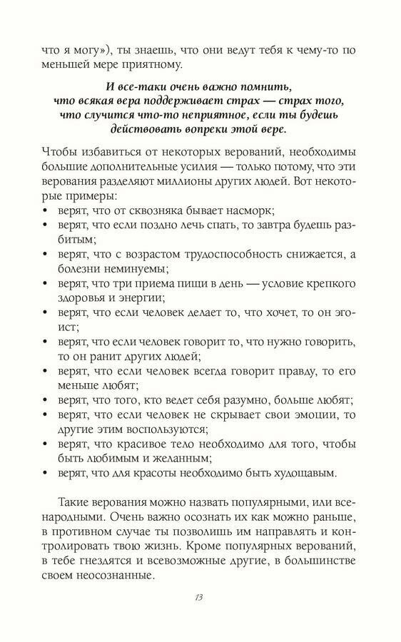 Книга поделена на 3 части - Быть, Делать, Иметь. И это позволяет рассмотреть свои убеждения в разных областях жизни - отношения с собой и своим телом, отношения с другими людьми, отношения с деньгами и так далее. Эта книга хороший инструмент самопознания, к которой я периодически возвращаюсь, перечитываю, чтобы осознать что-то новое, что раньше не замечала.
