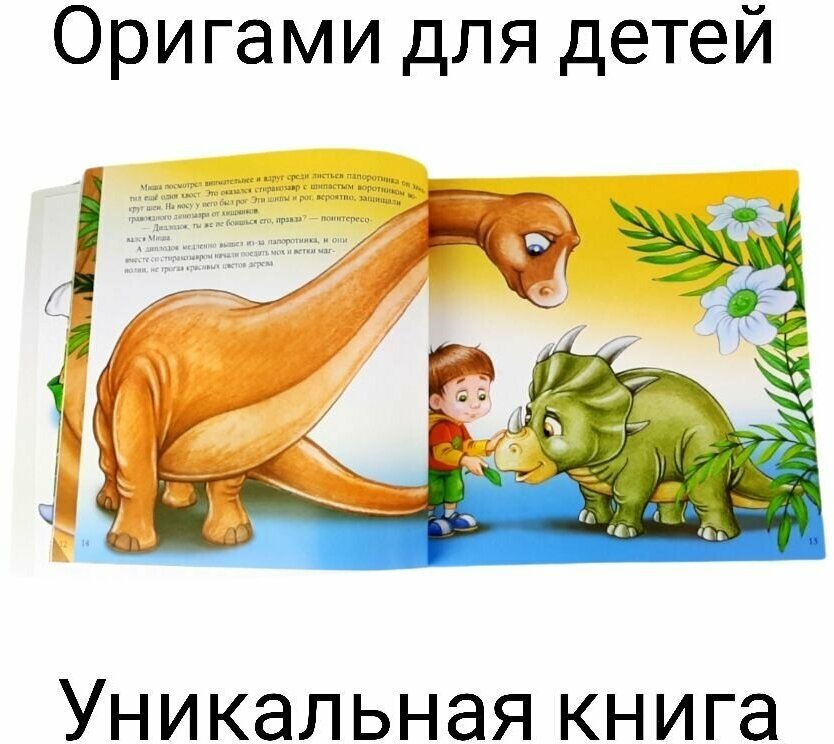 Дочь очень увлечена динозаврами. Поэтому купили эту книгу. Вначале прочитали небольшой рассказ о том, как старшая сестра сложила динозавров для братика: дочери - понравился, мне - нет. Его художественным текстом не назовешь. ну да и не это главное. Оригами... Во-первых, если Вы не профессионал, то некоторые фигурки сложить будет сложно, так как описание действий не всегда очевидно. Во-вторых, бумага (страница книги) не идеально квадратная, поэтому приходится дополнительно подгонять чтобы получалось правильно складывать. В-третьих, получившиеся Динозавры весьма отдаленно напоминают реальных.