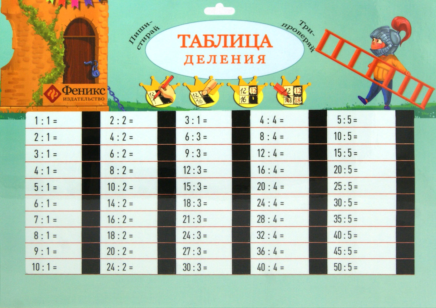 Издание для подготовки в школе "Таблица деления", на котором можно писать, стирать и проверять свои знания.