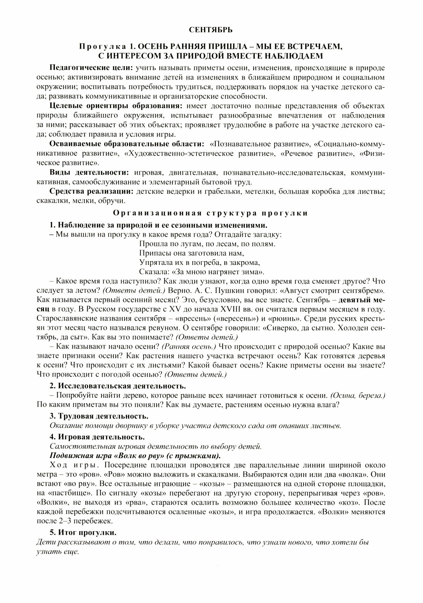 Комплект предназначен для педагогов и родителей и представляет собой планирование прогулок с детьми дошкольного возраста (от 6 лет) в форме картотеки. Современные требования, предъявляемые к планированию в дошкольном образовании, выделяют преимущества карточного планирования образовательного процесса. Использование подобного планирования ежедневных прогулок эффективно в практике ДОО, так как данная форма является удобной для педагогов. Картотека имеет тематическую основу, каждая прогулка пронумерована и предназначена для освоения детьми определенной темы в разных видах деятельности. В календарно - тематическом плане образовательной деятельности достаточно указать номер прогулки, так как в карточке более подробно указаны педагогические цели, целевые ориентиры образования, осваиваемые образовательные области, а также разнообразные виды детской деятельности и средства реализации прогулки. Пособие представляет систему карточек ежедневных сезонных прогулок, имеющих определенную структуру. В содержание каждой карточки включены: наблюдения за сезонными изменениями в природе, беседа по вопросам, трудовое поручение, исследовательская деятельность, которая чередуется с дидактическими играми, разнообразная игровая деятельность (подвижные и русские народные игры, игры народов мира, игры-забавы). В каждой карточке предложен богатейший материал для активизации речевой деятельности: приметы, поговорки, пословицы, загадки, словесные игры, подобранные в соответствии с возрастом детей, а также художественное слово. Работа педагога по карточному планированию сезонных ежедневных прогулок будет способствовать формированию эмоционально-положительного отношения к окружающему миру в процессе приобщения дошкольников к природе родного края, их личностному развитию в разных видах детской деятельности.