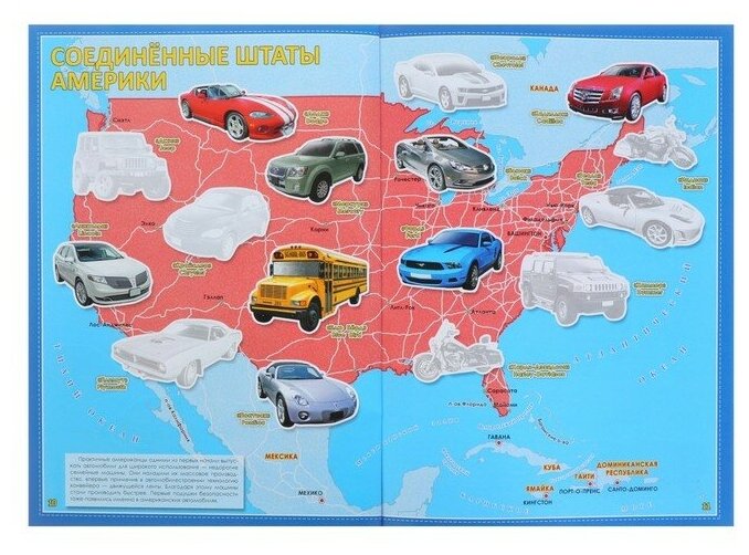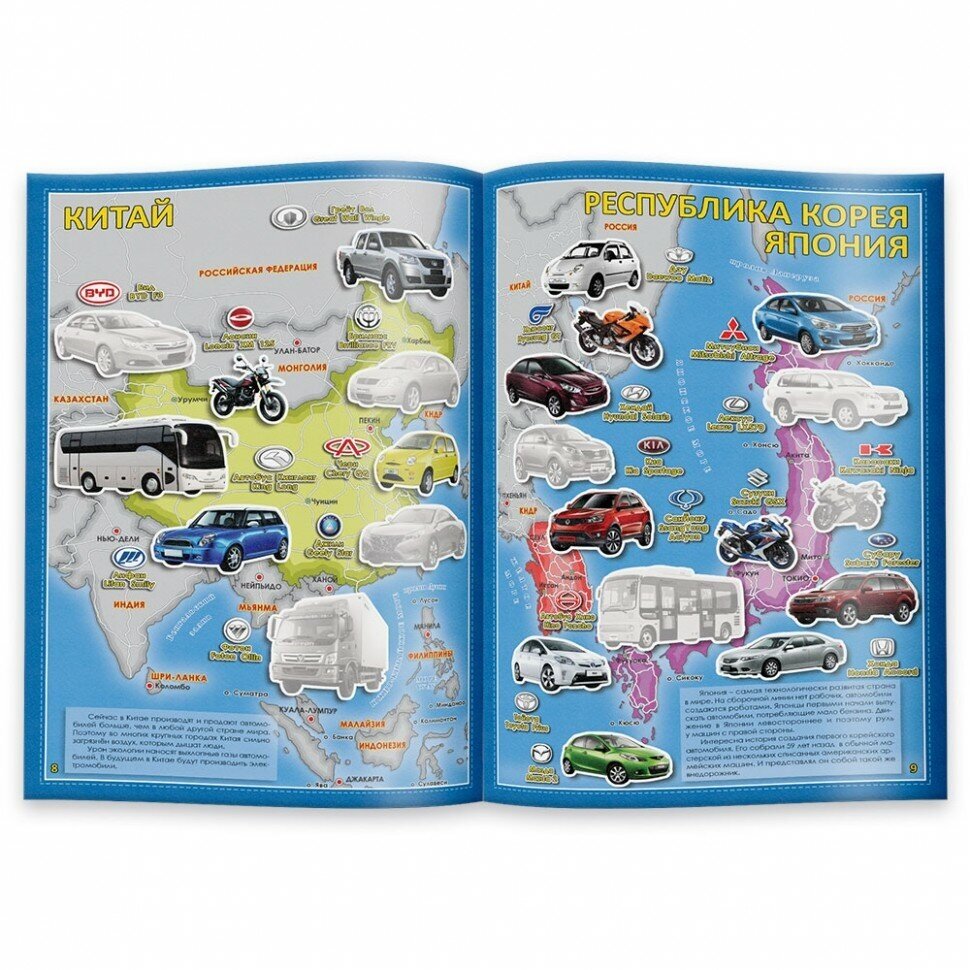 Атлас мира довольно познавательный, представлено 9 основных стран-производителей автомобилей. Но, по-моему , не полный. Не нашли наш любимый Ниссан, который занимает 5 место по продажам в России. Из наших легковых машин не представлен почему-то Уаз. Не понравилось. что мало наклеек - всего 1 лист. Большинство машин уже нарисовано. В общем, ребенку понравилось, а мне- из-за цены- нет. За такие деньги можно было бы побольше наклеек предложить.