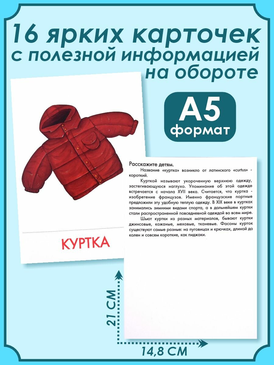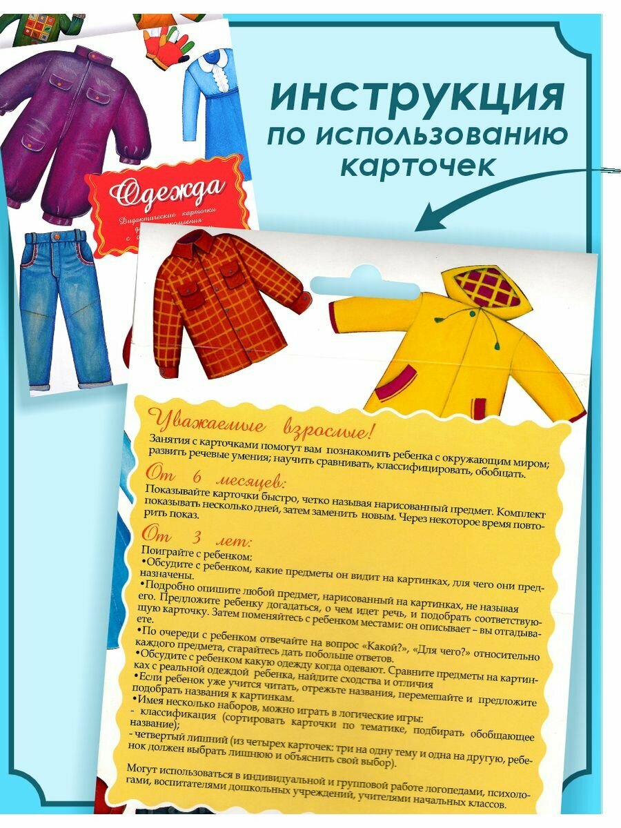 "Дидактические карточки "Одежда" - выбрала данные карточки за отличную информативность: понравилось - похожесть картинки на настоящую вещь и то, что на обороте карточки указана теория возникновения конкретной одежды. Также понравилось, что на упаковочной коробочке, перечислены возможные игры с применением данных карточек. Качество следующее: картинка с одеждой лащеная, а на обороте, где текст - немного шершавая. Цветопередача отличная, без искажения и преувеличения цветовой гаммы. Рекомендую дидактические карточки "Одежда"!