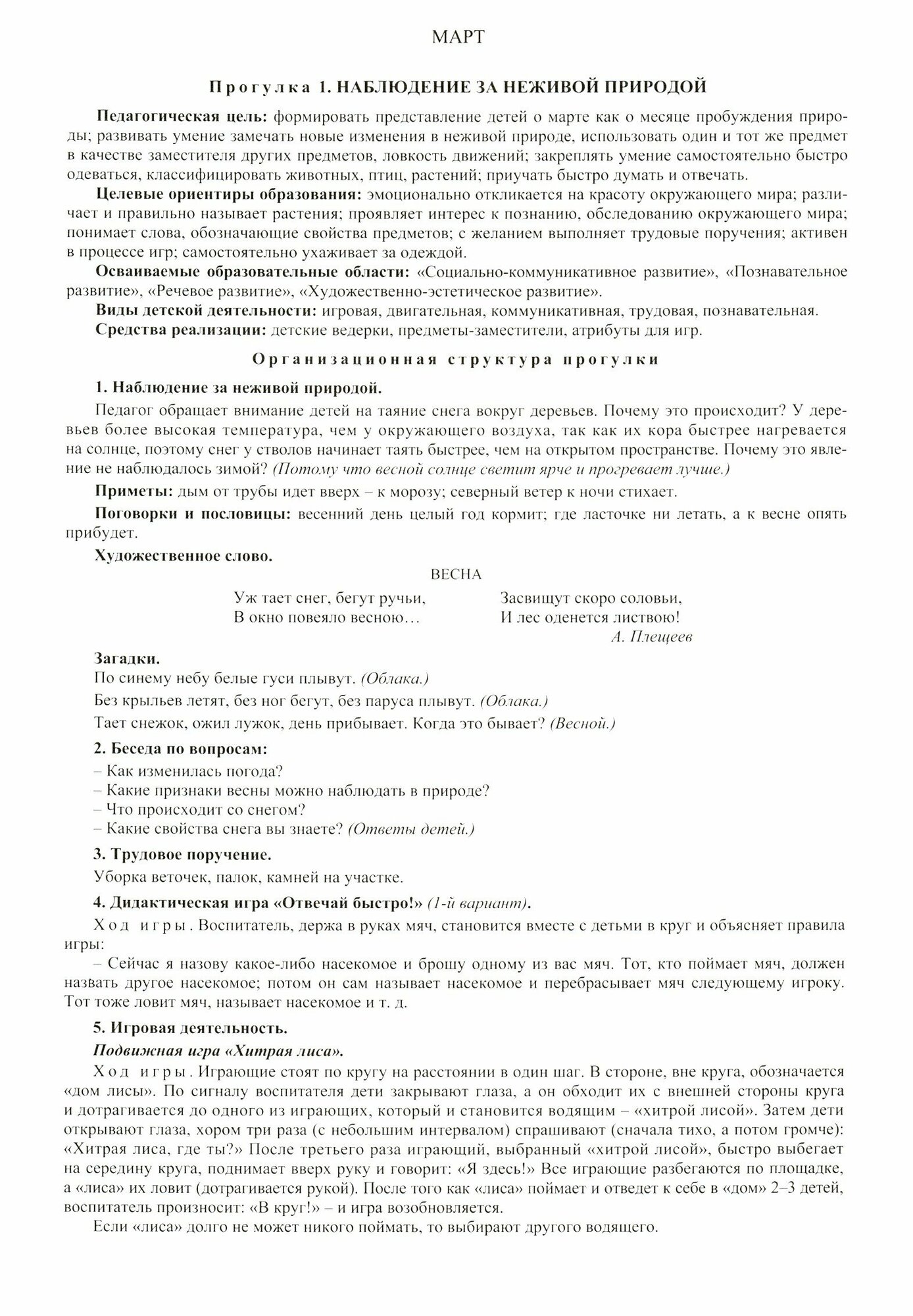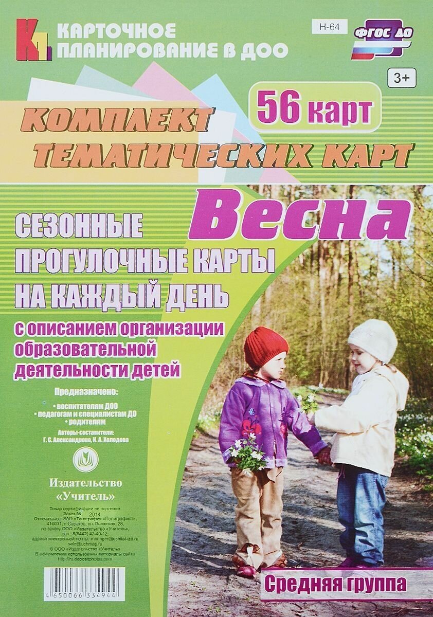Комплект содержит 56 карт с сезонными весенними прогулками на каждый день для организации образовательной деятельности с детьми средней группы. Картотека имеет тематическую основу, в ней определены педагогические цели, целевые ориентиры образования, осваиваемые образовательные области, соответствующие ФГОС ДО. Каждая карта-прогулка пронумерована и предназначена для освоения детьми определенной темы в разных видах деятельности: исследовательская, игровая, речевая, коммуникативная, трудовая, познавательная. Предложен богатейший материал для активизации речевой деятельности: приметы, поговорки, пословицы, загадки, словесные игры, художественное слово, подобранный в соответствии с возрастом детей.