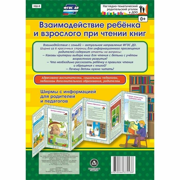 Взаимодействие ребенка и взрослого при чтении книг. Ширмы с информ. для родителей и педагогов. (без автора); Учитель, 2019