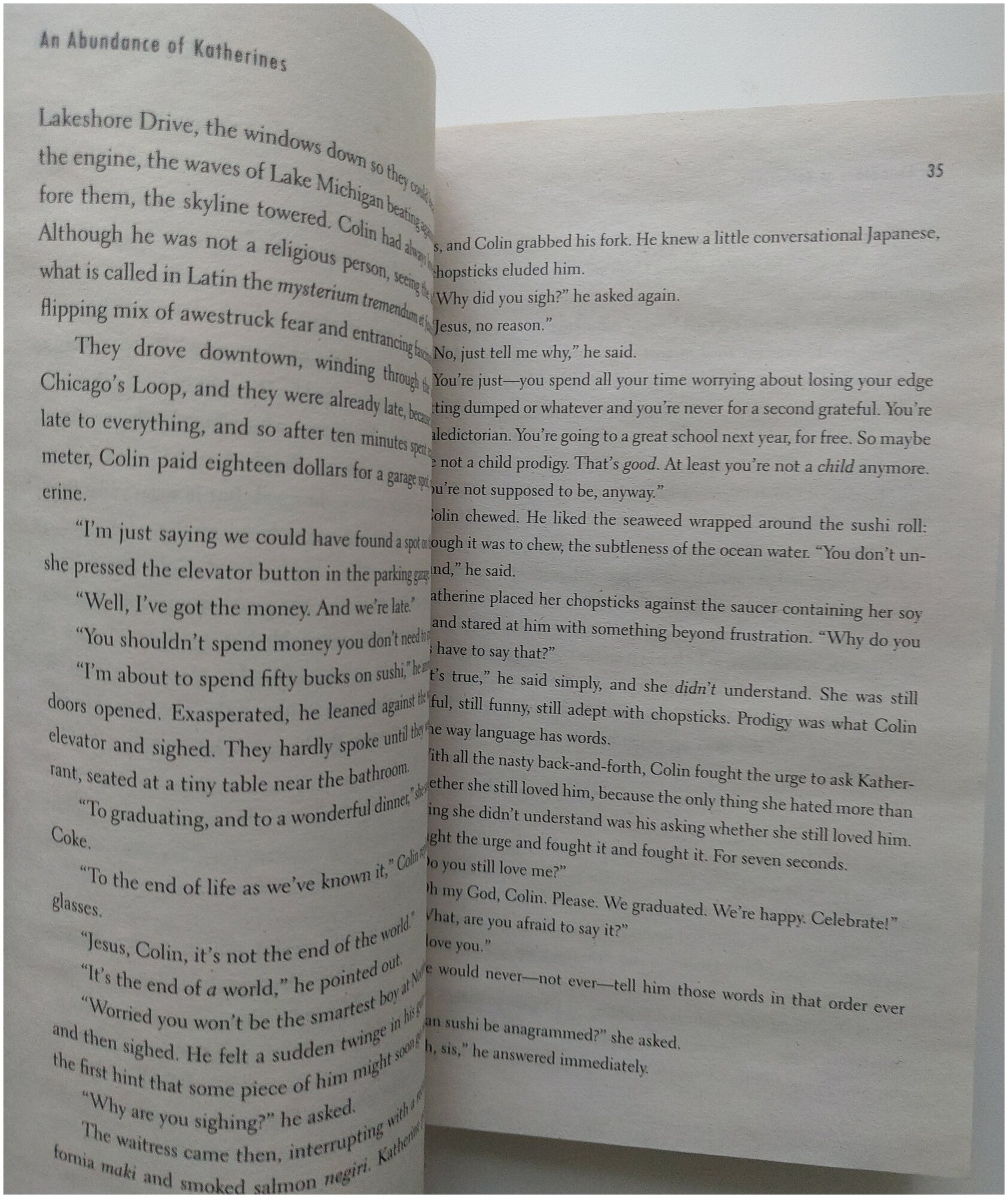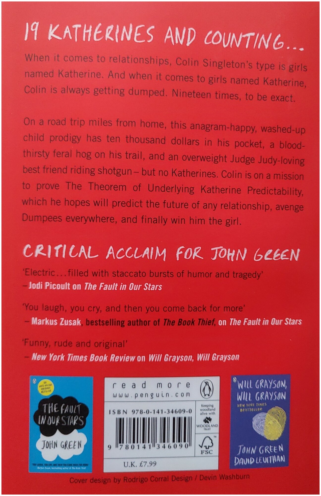 When it comes to relationships, Colin Singleton's type is girls named Katherine. And when it comes to girls named Katherine, Colin is always getting dumped. Nineteen times, to be exact. On a road trip miles from home, this anagram-happy, washedup child prodigy has ten thousand dollars in his pocket, a bloodthirsty feral hog on his trail, and an overweight, Judge Judy - loving best friend riding shotgun - but no Katherines. Colin is on a mission to prove The Theorem of Underlying Katherine Predictability, which he hopes will predict the future of any relationship, avenge Dumpees everywhere, and finally win him the girl.