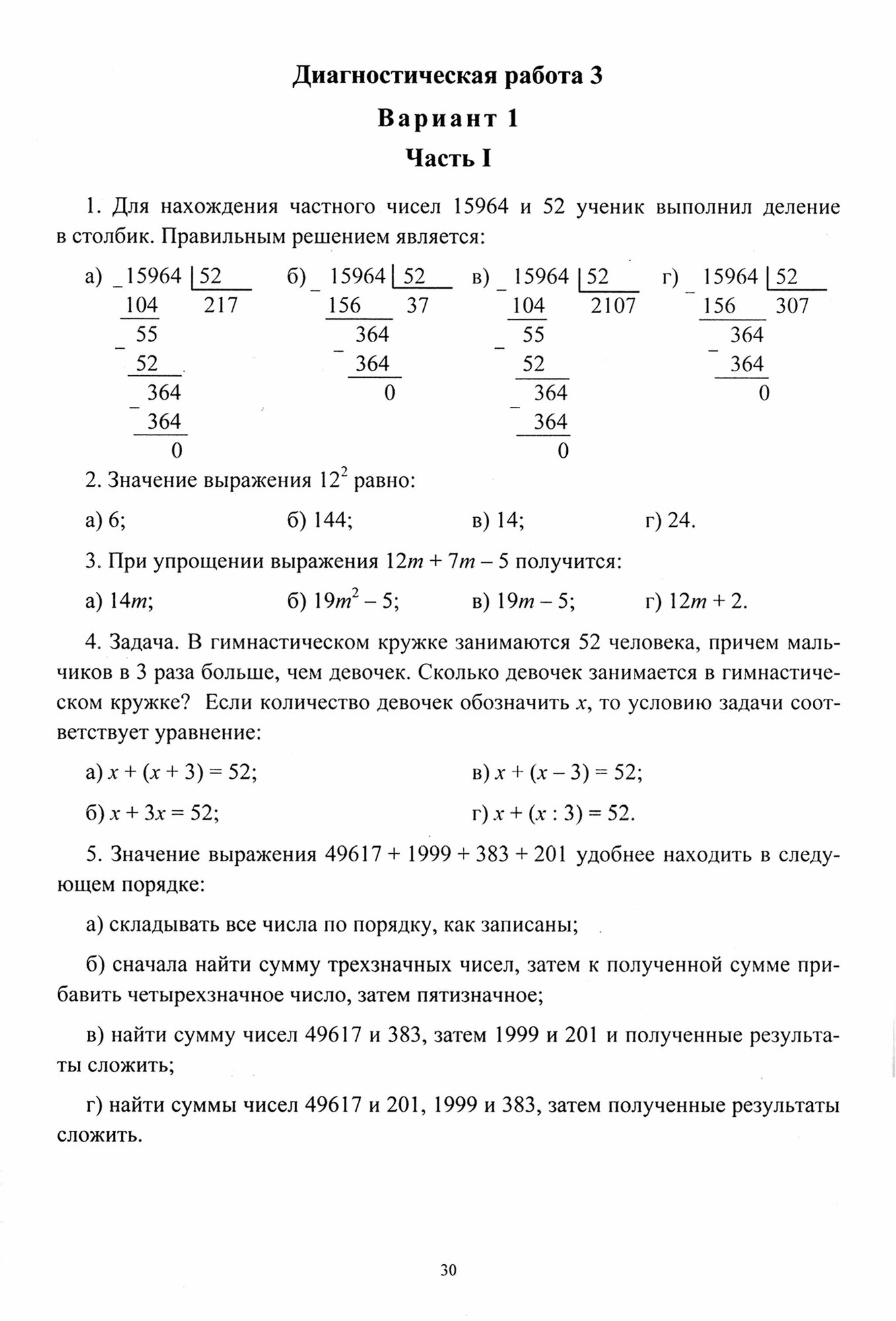 Неоценимую помощь в формировании у школьников умений применять полученные знания в жизни, организовывать свою деятельность, ставить цели и продумывать пути их достижения оказывает современная диагностика образовательных результатов. Именно с этой целью разработаны и внедряются федеральные государственные образовательные стандарты. В этих условиях учителю необходимо иметь четкое представление о том, как должна выглядеть диагностическая работа, в чем отличие диагностической работы от обычной контрольной или самостоятельной работы и, самое главное, как интерпретировать результаты проведенных диагностических работ, самому уметь составлять диагностические карты, позволяющие наглядно отображать индивидуальные успехи и неудачи каждого ученика и класса в целом. Пособие призвано сопровождать педагогов в решении этих проблем. Представлены 5 диагностических работ (по 4 варианта в каждой) для оценки качества освоения программного материала пятиклассниками, диагностические карты, примеры их заполнения и анализа, лист успешности.