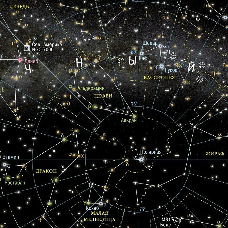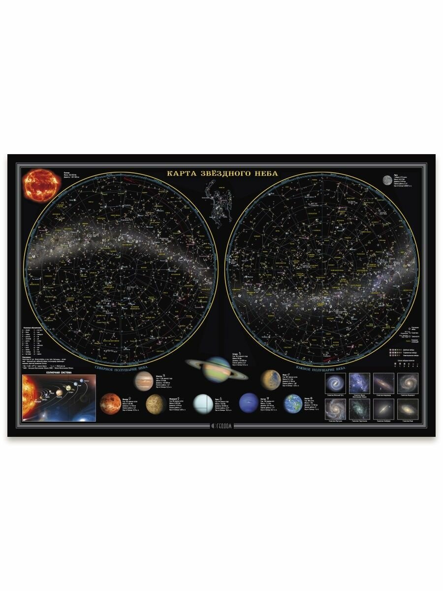 На карте звездного также отражена Солнечная система - Солнце и обращающиеся вокруг него небесные тела - 8 планет. Для более точного представления звездного неба даны таблицы характеристик планет, галактик, туманностей, самых ярких звезд и других космических объектов.