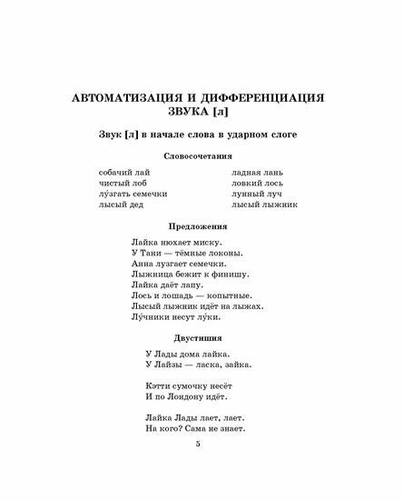 В книге представлено много разнообразных заданий, направленных на автоматизацию поставленных звуков. Задания идут от более простых - автоматизация звука в словосочетаниях, к сложным. Есить задания на дифференциацию звуков, например, Л - В, Л - Р и другие. Также в книге есть иллюстративный материал: игры и задания, разные кроссворды, ребусы. Книга очень понравилась, как и две другие в этой серии.