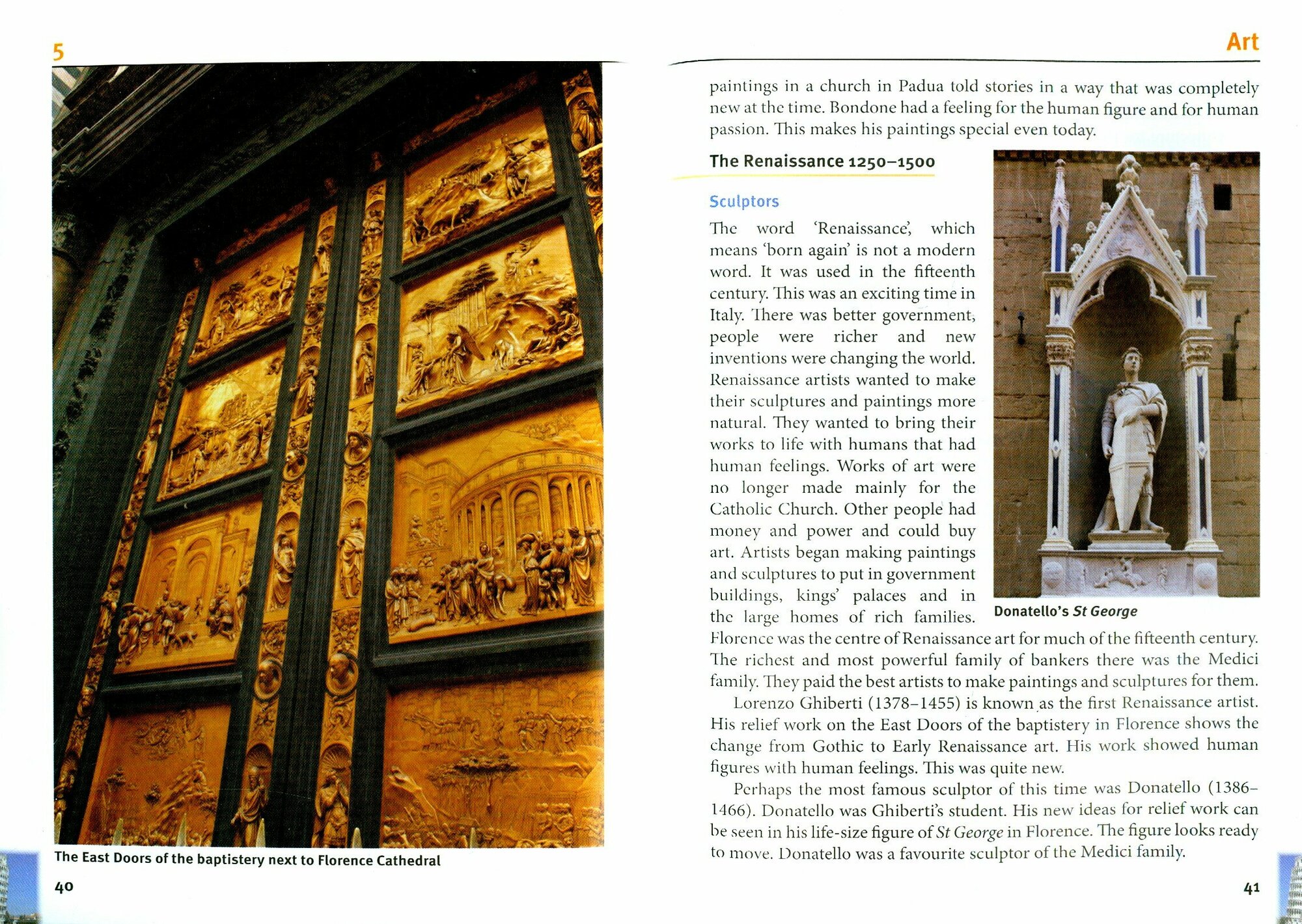 Замечательная, красочная книга об Италии на английском языке. Книга небольшая, но очень информативная, есть карта Италии. Разделена на главы: природа, климат, национальная кухня, история, литература, искусство и т.д. Информация в сжатой форме, но ничего не упущено, единственное чего мне не хватило-это описания характера итальянцев и их традиций. Очень красиво оформлено, бумага мелованная, уровень английского-Pre-intermidiate, в конце книги словарик и упражнения к главам книги.