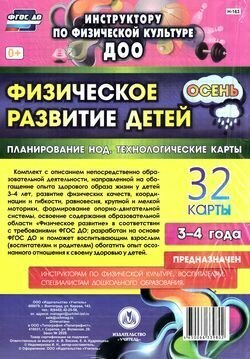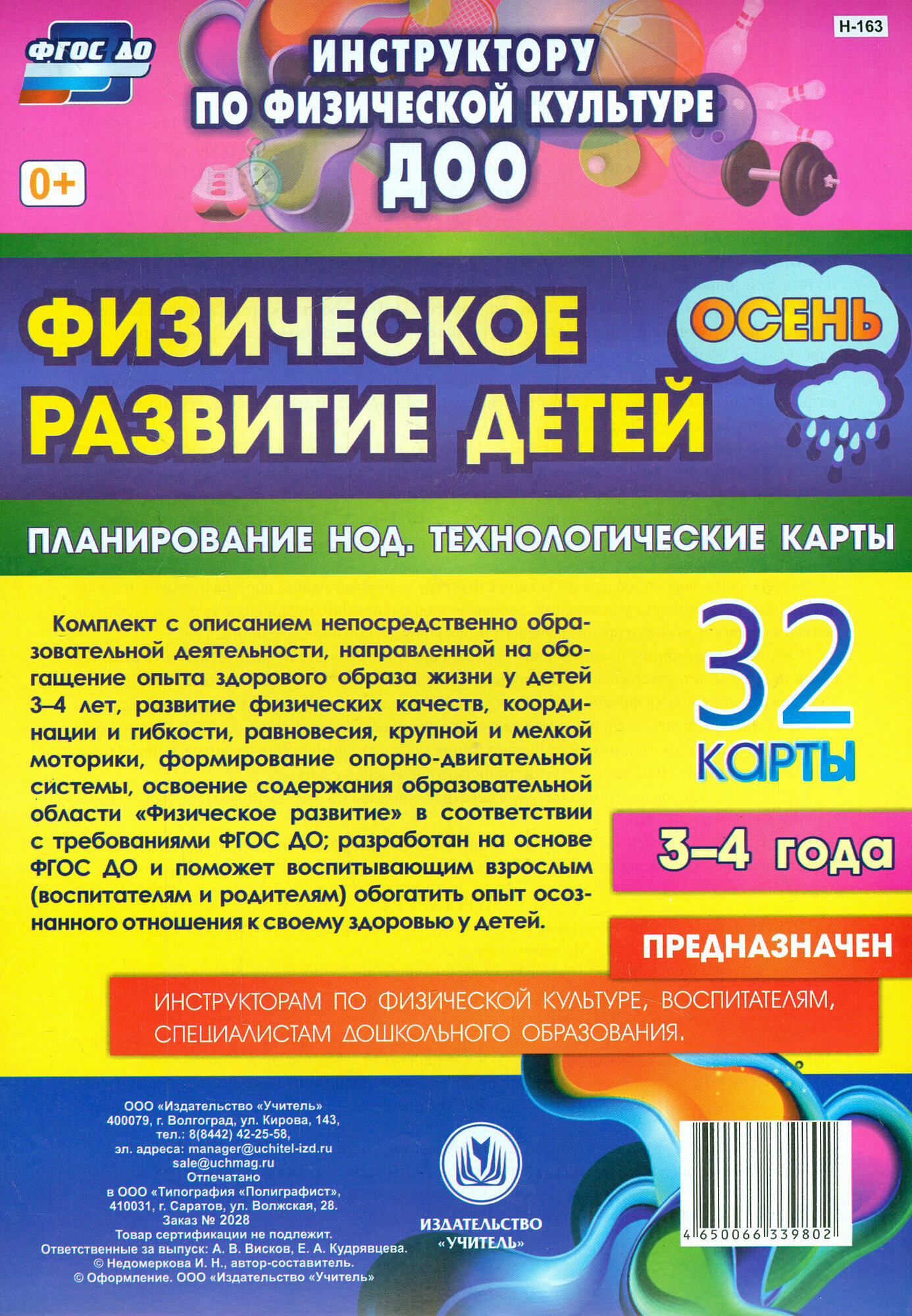 Физическое развитие детей 3-4 лет. Осень. Планирование НОД. Технологические карты. 32 карты. ДО (Недомеркова Ирина Николаевна (составитель)); Учитель, 2017