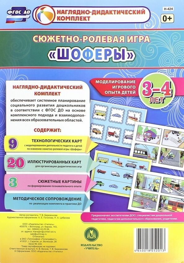 Предлагаемый наглядно-дидактический комплект включает 9 технологических карт, позволяющих комплексно, целостно и последовательно планировать образовательную деятельность по обогащению социального опыта детей 3-4 лет на основе содержания сюжетно-ролевой игры "Шоферы" в течение учебного года. Представлены также иллюстрированные разрезные карты и красочные сюжетные рисунки (23) для организации бесед, наблюдений, составления рассказов, дидактических игр обучающего и развивающего назначения, соответствующие теме.