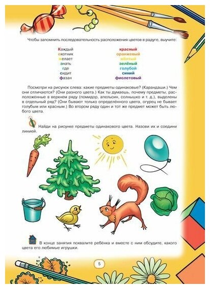 Ещё до изучения цифр и решения примеров ребёнок познакомится с признаками предмета (цвет, форма, размер) и научится сравнивать предметы по признаку, запомнит состав чисел от 1 до 10. Все задания в книге читает взрослый, ребёнок лишь выполняет задания.
