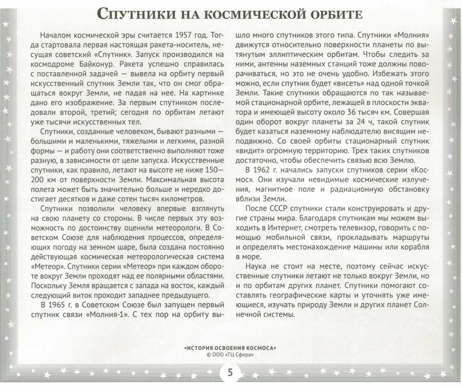 Комплект демонстрационных материалов "История освоения космоса": знакомит детей с этапами покорения космоса: изобретение ракеты, запуск первого искусственного спутника Земли, отправка первых живых существ в космос, исследования Луны, Марса, Венеры; рассказывает об устройстве космического корабля, орбитальной станции, космодрома. Также предлагает обзор открытий и научных достижений, предшествовавших космическим полетам, сделавших их возможными. Знания даются сжато, но в достаточном для ребенка 6-11 лет объеме. Работа с материалами поможет дошкольникам и младшим школьникам расширить кругозор и пробудить тягу к познанию окружающего мира; воспитывать чувство гордости за достижения нашей страны. Наглядные рисунки спутников, ракет, космических аппаратов проиллюстрируют рассказ. Рекомендуем использовать их для постоянной или временной экспозиции в группе или классе. Пособие подходит для индивидуальной и групповой работы.