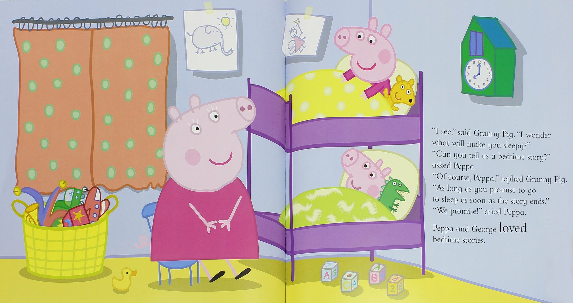 It's time for bed but Peppa and George are absolutely, definitely, not even a little bit tired in this delightful brand new picture book. A bedtime story from Granny Pig, Grandpa Pig, Daddy Pig AND Mummy Pig should send them to sleep . . . Shouldn't it?