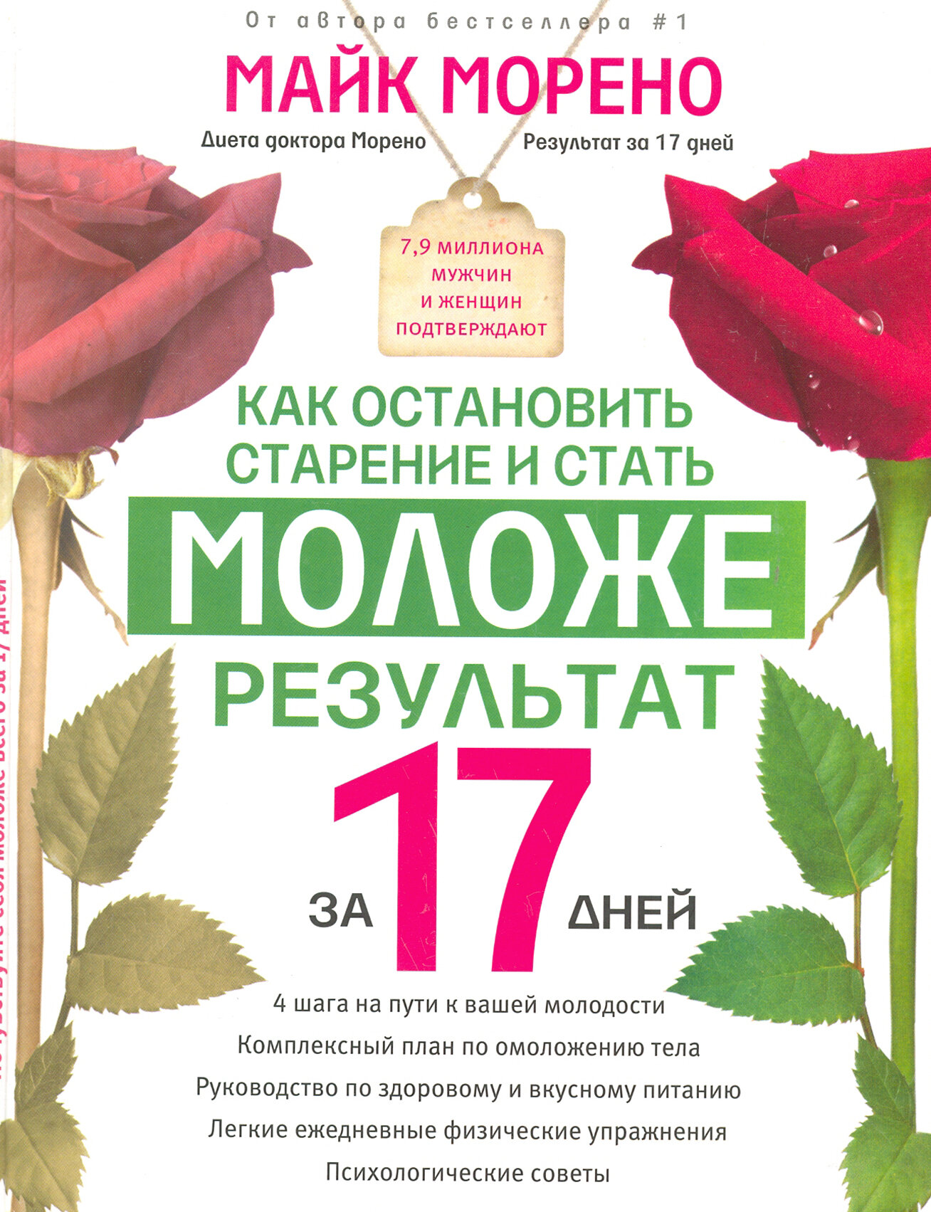 Как остановить старение и стать моложе Результат за 17 дней. Майк Морено разработал эффективную методику сначала для похудения, а теперь и для общего состояния организма. Прекрасная книга, читается на одном дыхании . Рекомендации и советы реальные. Легко придерживаться и выполнять все правила и упражнения. Оформлена книга хорошо, твердый переплет, стандартный шрифт,читать удобно. Реальная польза!