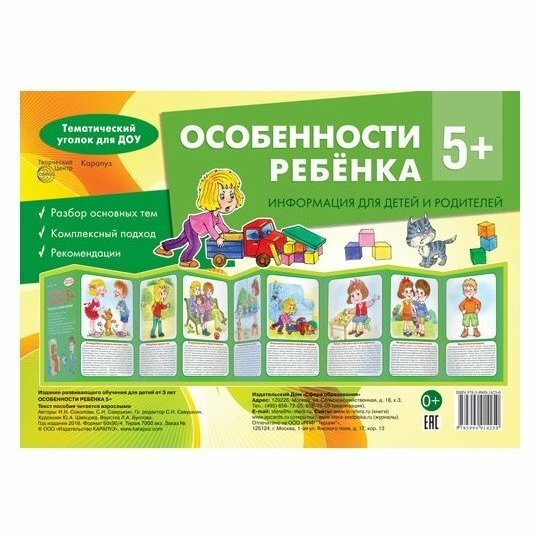 Представляем вам информационную ширмочку для детей и родителей& 171;Особенности ребенка 5+& 187;. В ней представлены следующие темы: Почему& 171;сюсюкает& 187; и кривляется Почему не уверен в себе Почему предпочитает общество взрослых Почему делает все наоборот Почему отказывается выполнить просьбу или задание Почему плачет, если у него что-то не получается Почему начинает интересоваться противоположным полом Почему шмыгает носом или моргает ISBN:978-5-9949-1425-0
