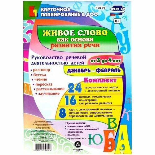 В комплекте, включающем 24 технологические карты и 16 тематических иллюстраций, а также методические рекомендации по организации образовательной работы по направлению "Речевое развитие" (разделы развитие связной речи и ознакомление с художественной литературой), раскрывается система работы по ознакомлению детей 3-4 лет с живым словом на декабрь-февраль учебного года. В представленном карточном планировании описана педагогическая деятельность по совершенствованию речи дошкольников, обогащению словарного запаса, формированию умения правильно строить речевые высказывания в соответствии с ФГОС ДО, освещена методика развития словесного творчества детей младшего дошкольного возраста, рассмотрены сочетающиеся виды деятельности художественно-речевой направленности - разговор, беседа, рассказывание и пересказ, поручения и задания, чтение художественной литературы, заучивание стихотворений. Комплект предназначен для педагогов ДОО, родителей дошкольников.