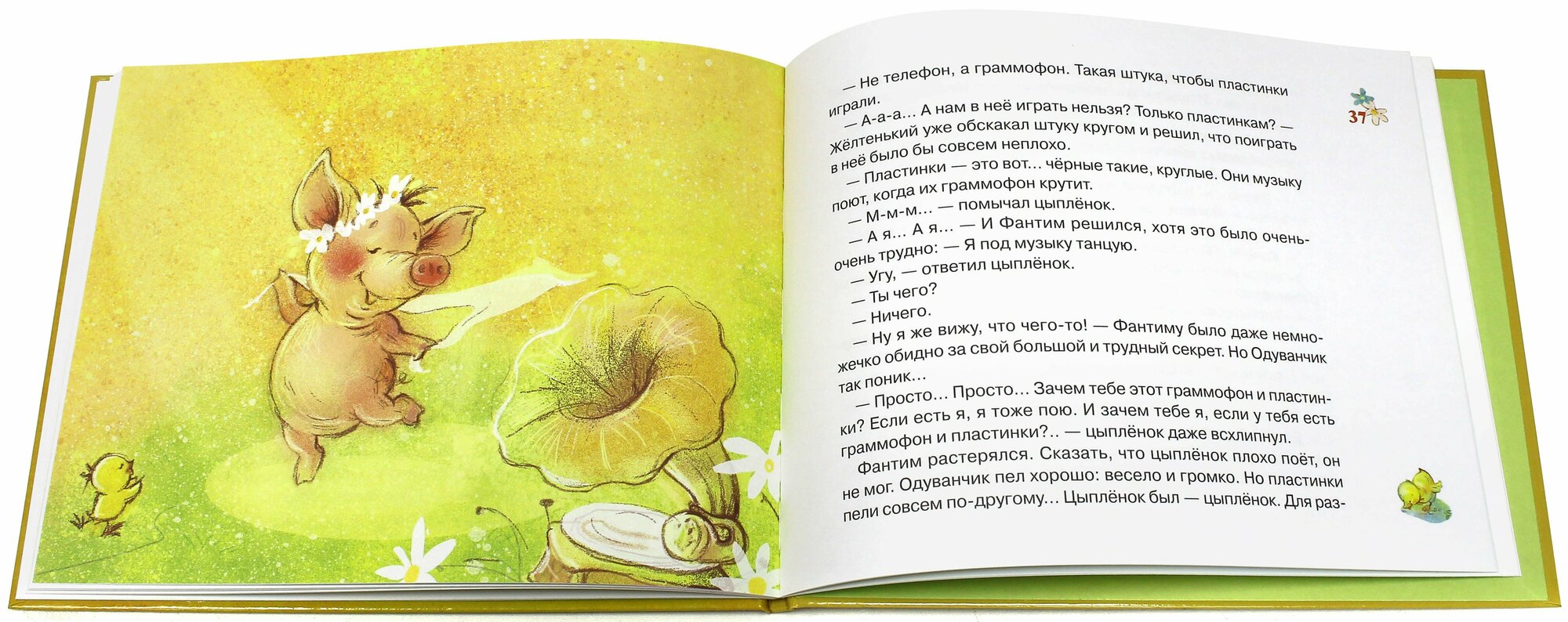 Прелестная история о дружбе двух очень непохожих существ. В отличие от многих сказок, где друзьями просто становятся разные животные с разными повадками, тут дело еще и в характере. Фантим - философ (хотя и не знает такого слова), он немного замкнутый, задумчивый, стеснительный. Одуванчик - открытый, радостный, громкий, эмоциональный. (Фантим тоже эмоциональный, но иначе.) И хотя между поросенком и цыпленком мы видим полное взаимопонимание, все же дружба здесь не случилась "вот так сразу", по мановению волшебной палочки.Они притирались друг к другу, привыкали, а поросенок долго не решался доверить самую сокровенную тайну. А цыпленок выражал свое отношение к другу с помощью песни, и пусть у него не всегда получалось, он очень старался. Словом, в этой книге видно: если вы даже не похожи, у вас все равно может быть много общего. Общие тайны, общие радости... вы можете многое друг другу рассказать.