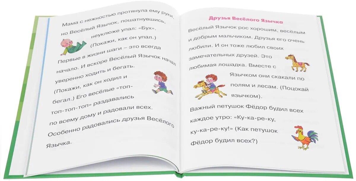 Книга очень понравилась. Формат А4, твердая обложка, яркие, довольно крупные рисунки. Заниматься по ней с ребенком дома очень удобно. Упражнения показаны, расписаны. Все ясно и понятно. Хорошие сказки про маленького язычка, сопровождающиеся речевой и пальчиковой гимнастикой, что делает их увлекательными для ребенка. Ничего лишнего. Все необходимое для развития у ребенка общих речевых навыков.