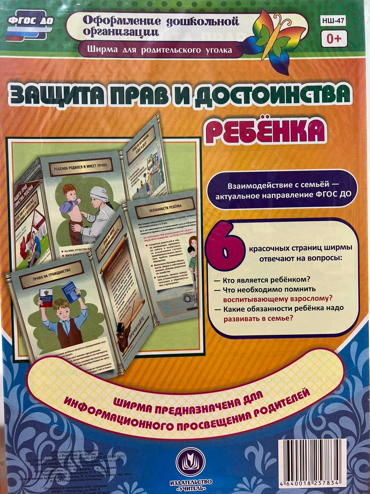 Взаимодействие с семьёй - актуальное направление ФГОС ДО. Данная ширма предназначена для информационного просвещения родителей. 6 красочных страниц содержат сведения о том, какие права и обязанности есть у дошкольника. Родители получат ответы на вопросы: