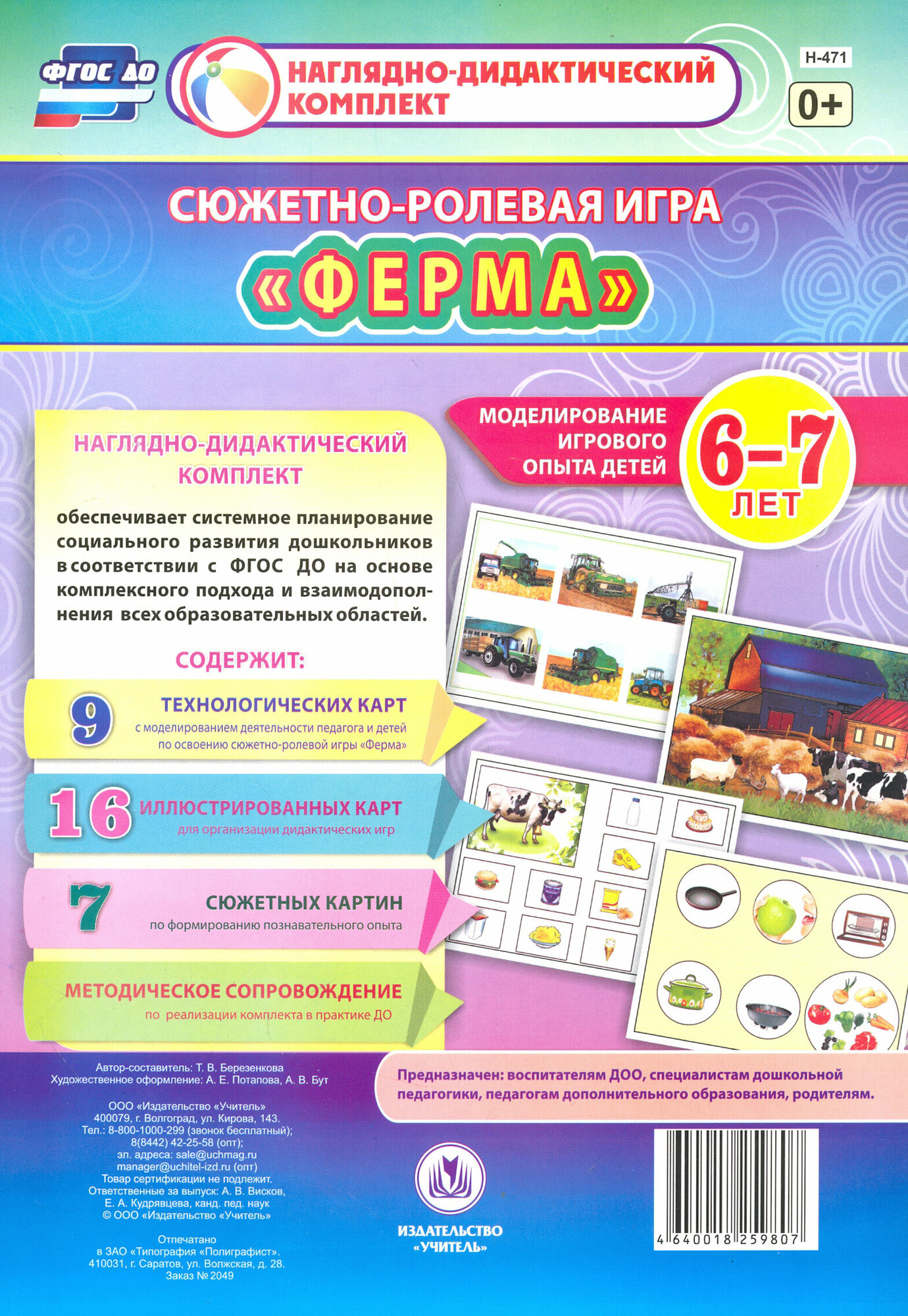 Предлагаемый наглядно-дидактический комплект включает 9 технологических карт, позволяющие комплексно, целостно и последовательно планировать образовательную деятельность по обогащению социального опыта детей 6-7 лет на основе содержания сюжетно-ролевой игры "Ферма" в течение учебного года. Представлены также 23 иллюстрированные разрезные карты и красочные сюжетные рисунки для организации бесед, наблюдений, составления рассказов, дидактических игр обучающего и развивающего назначения соответствующие теме.