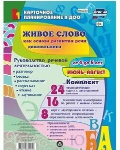 В комплекте, включающем 24 технологические карты и 16 тематических иллюстраций, а также методические рекомендации по организации образовательной работы по направлению "Речевое развитие" (разделы развитие связной речи и ознакомление с художественной литературой), раскрывается система работы по ознакомлению детей 4-5 лет с живым словом на июнь-август учебного года. В представленном карточном планировании описана педагогическая деятельность по совершенствованию речи дошкольников, обогащению словарного запаса, формированию умения правильно строить речевые высказывания в соответствии с ФГОС ДО, освещена методика развития словесного творчества детей младшего дошкольного возраста, рассмотрены сочетающиеся виды деятельности художественно-речевой направленности - разговор, беседа, рассказывание и пересказ, поручения и задания, чтение художественной литературы, заучивание стихотворений.