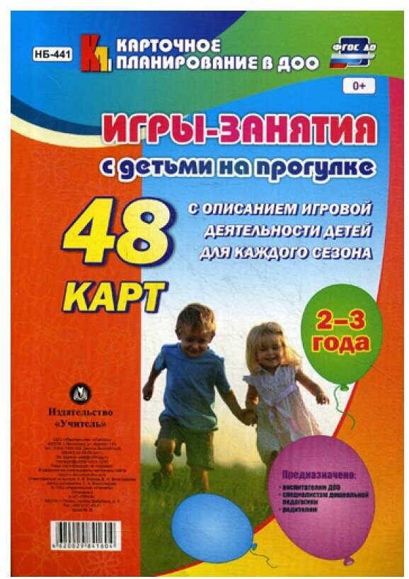 В комплекте из 48 тематических карт представлены игры-занятия с детьми 2-3 лет на прогулке с описанием игровой деятельности для каждого сезона, разработанные на основе положений ФГОС ДО.