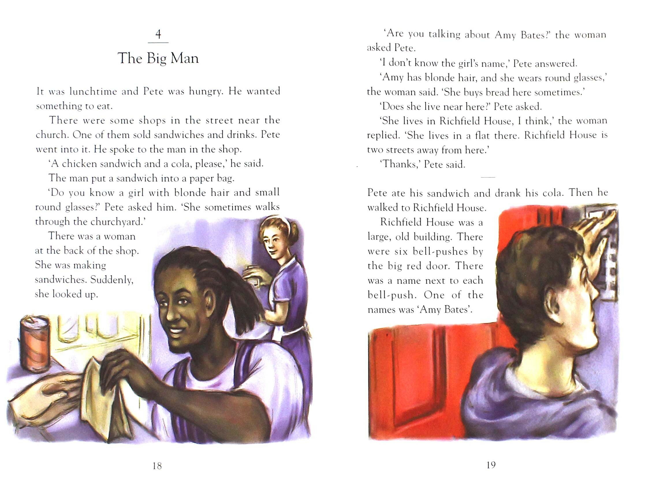 Pete takes the cassette to a film developing shop. One hour later, he has the photographs. One picture shows two men. They are near a church. A man in a suit is giving a large brown envelope to another man. This other man is big and heavy and he is wearing a red shirt.