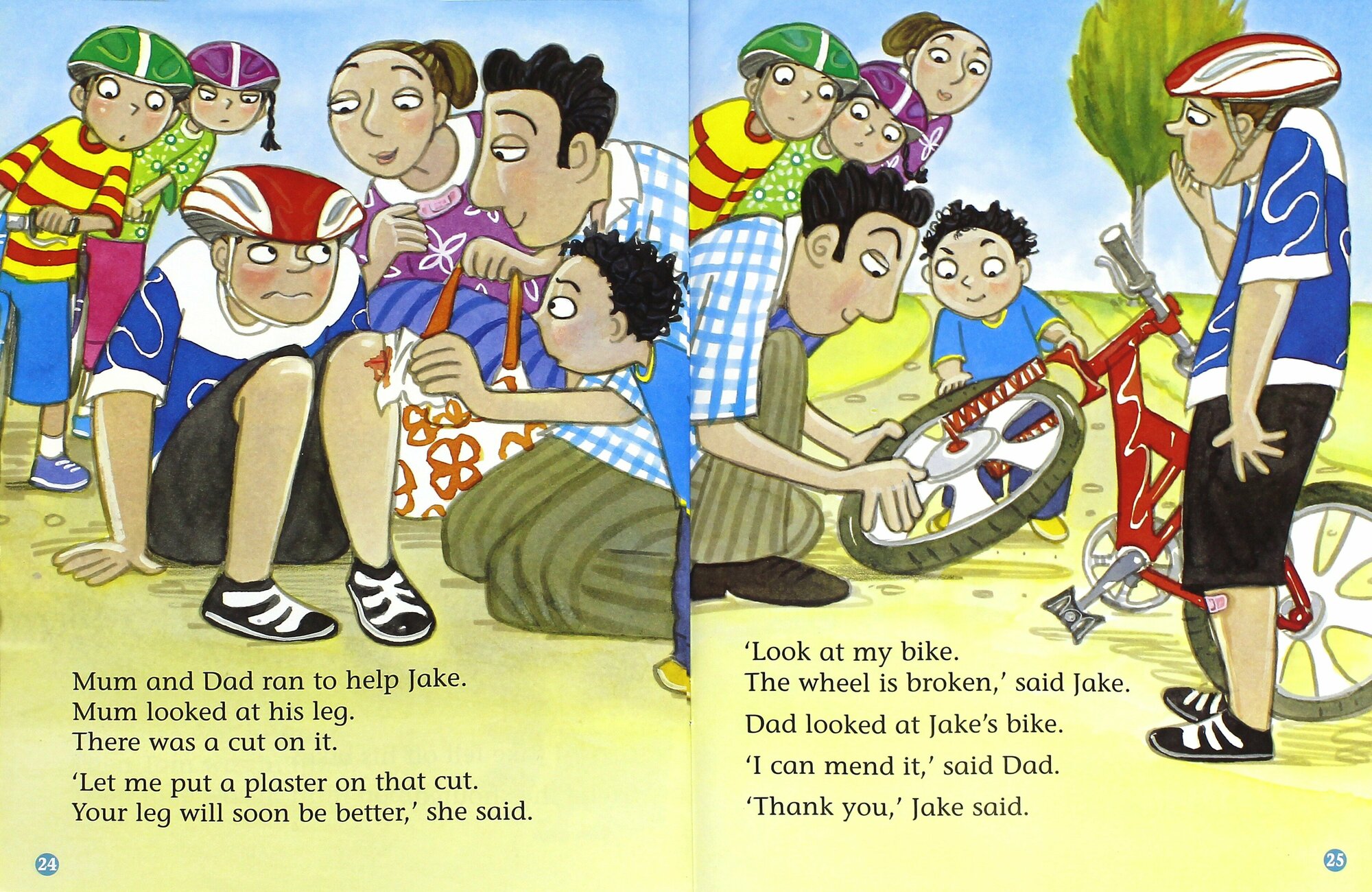 In this Holly and Tom story about bullying and friendship, Holly and Tom go to the park with Mum and Dad to ride their bikes. They meet Jake and he challenges Tom to a bike race. They race too fast and get hurt and break their bikes. They agree that it is better to be friends.