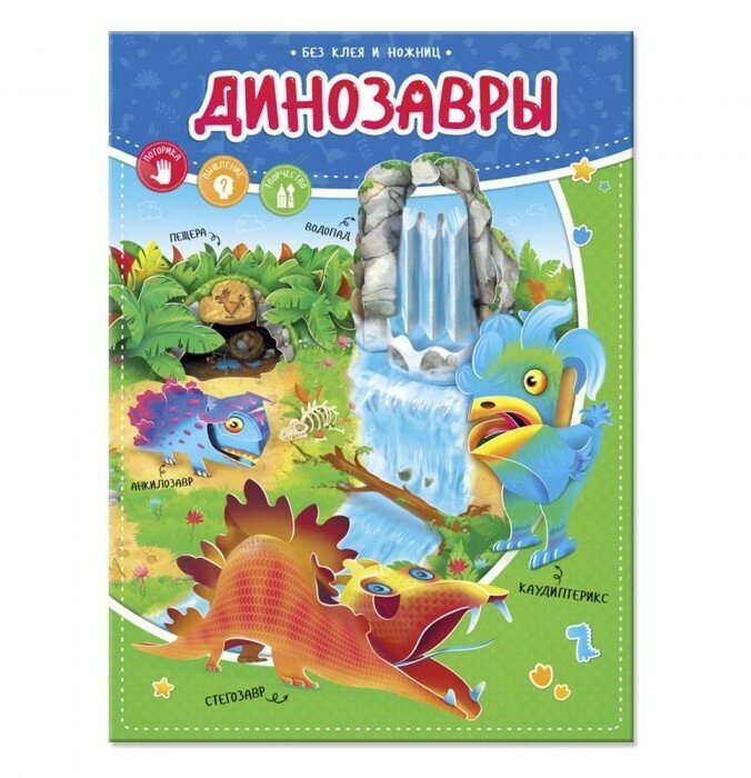 Чудесный водопад, кладка яиц каудиптерикса в пещере - даже этого было бы достаточно!! Но в альбоме "Динозавры" есть и 4 динозавра, которых так же можно соорудить без ножниц и клея))