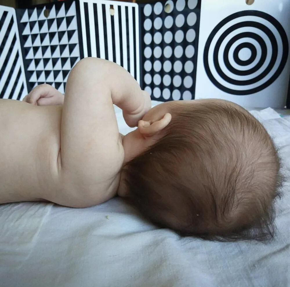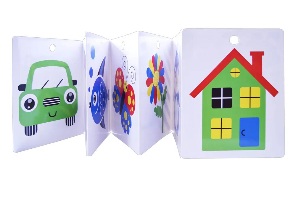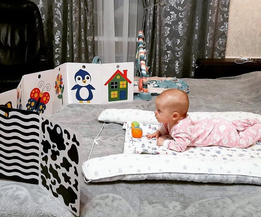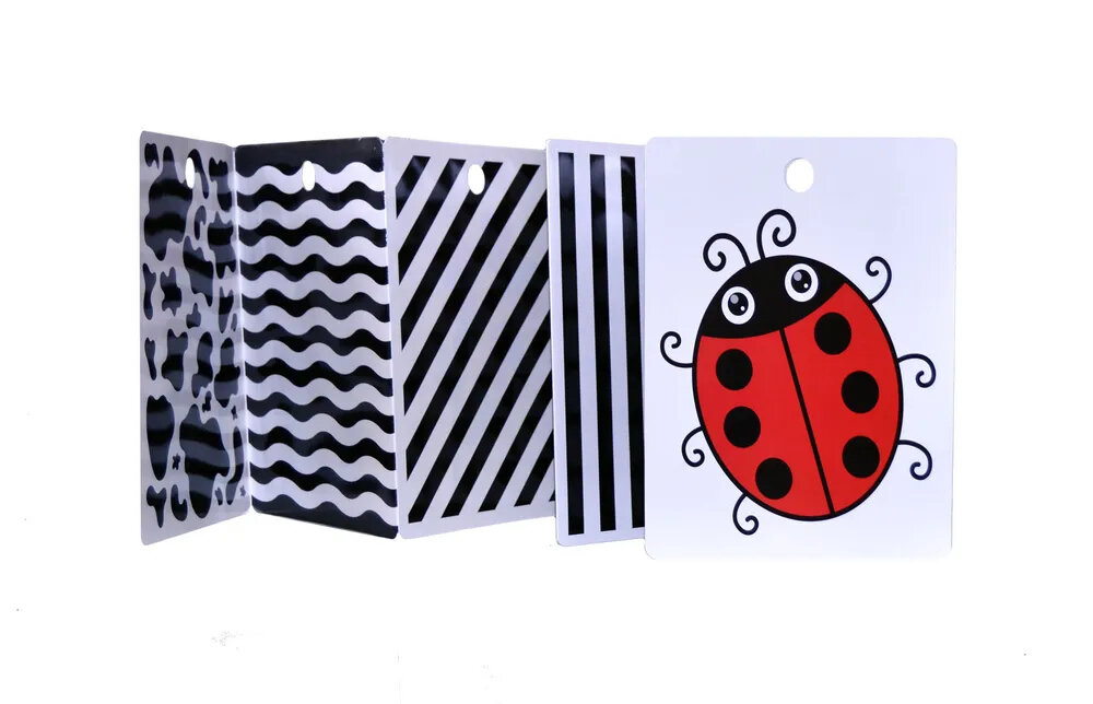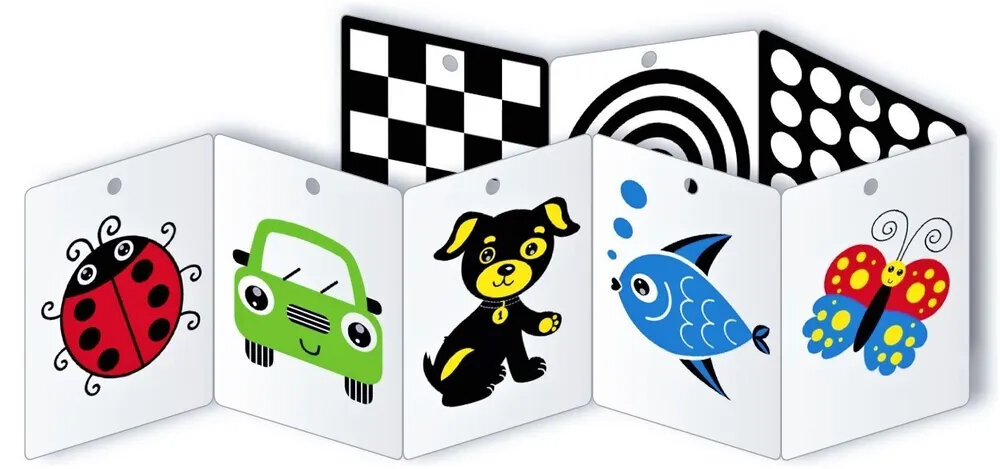 Хорошие карточки из очень плотного материала, правда сомневаюсь, что это картон, так как имеется неприятный запах и на зуб малышу я такое не рискну давать. Двусторонние, на одной чёрная картинка на белом фоне, на другой наоборот. 8 штук, соответственно 16 изображений. Прилагается инструкция. Картинки прорисованы чётко, но объяснить и даже просто дать название некоторым сложновато. В ходу у нас было 5 штук. Есть отверстия для подвешивания. До 4х месяцев ребёнок разглядывал периодически, сейчас нам 7 и такое уже не интересно. Считаю, что комплект с животными лучше.