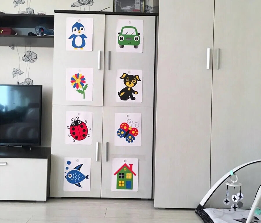 Карточки сделаны из плотного картона, в каждой карточке есть специальное отверстие для подвешивания. Карточки развивают мышление малыша, способствуют раннему развитию. Думаю, что это лучшее решение для родителей, которые заботятся о своих детях и хотят, чтобы ты выросли умными. В серии несколько интересных наборов на разные тематики.