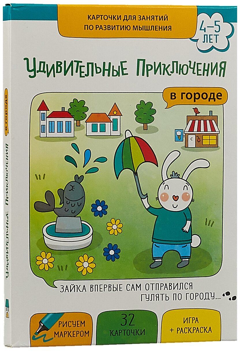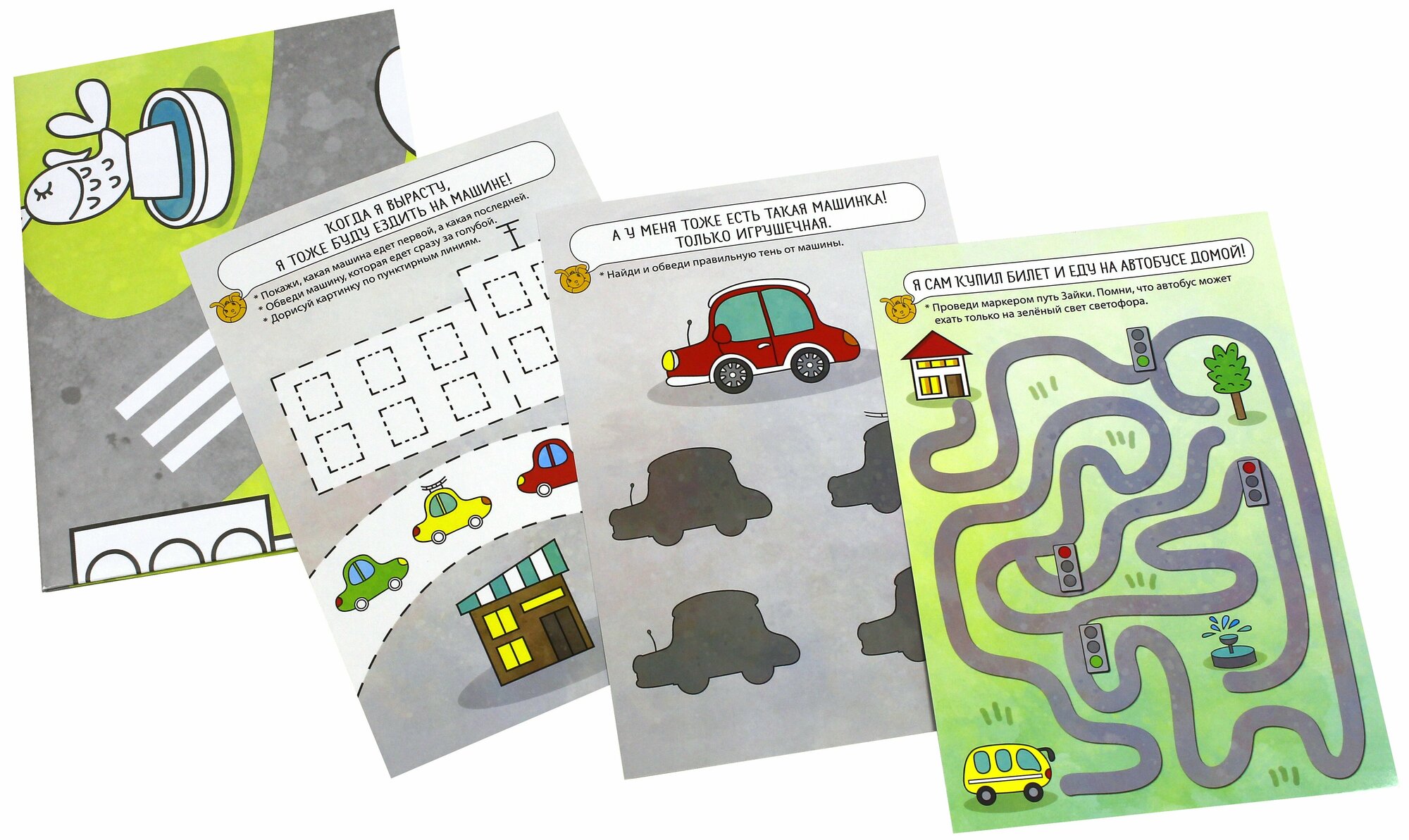 Ламинированные карточки с развивающими заданиями. Картинки рассказывают о приключениях Зайки в городе. Крупным шрифтом написаны слова Зайки, мелким - задания, которые нужно выполнить маркером. Ребёнок может многократно рисовать, тренируя координацию движений, умение сравнивать и размышлять.