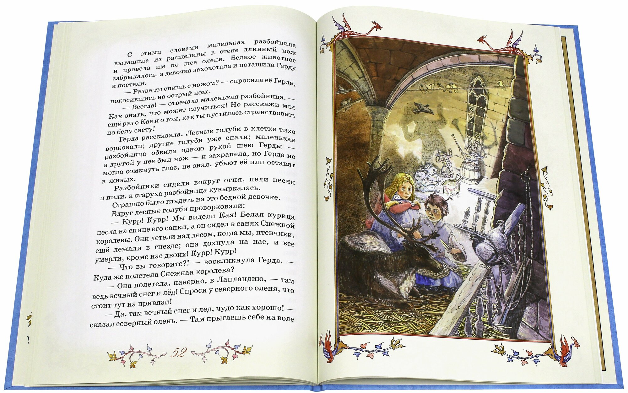 Я собираю "Снежных королев", потому-что мне интересно как художники видят и интерпретируют образы героев сказки. Художник Баринов Алексей. Манера исполнения его иллюстраций пуантилизм (мелкие точки и мазки кистью) присущий импрессионистам и образы в стиле русский лубок создают необычное зрелище. Видно, что художник любит собак-бульдогов (наряжая их в английский шлем). Образ разбойницы просто прелесть (озорная девчонка), а вот Герда и Кай болезненны и задумчиво грустны, принцесса с молодым супругом это просто милые хоббиты, лапландка с рыбой это просто финиш. Некоторые чёрно-белые заставки сморятся иногда лучше полностраничных иллюстраций. Эклектика и разнобой, но не смотря на это, книга смотрится хорошо и неординарно.