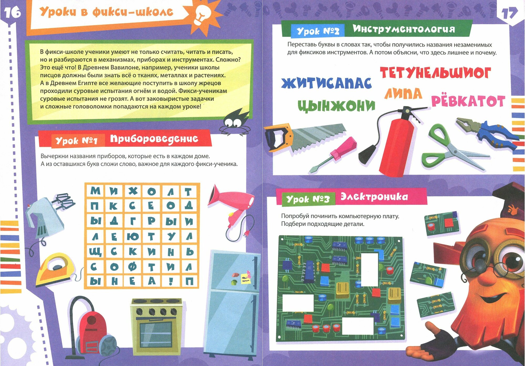 Содержит очень много разнообразных заданий: ребусы, шифры, филворды и прочие головоломки. Есть ходилка, штриховки, обводки, стихи ("Фикси-азбука"). Задания разного уровня сложности.