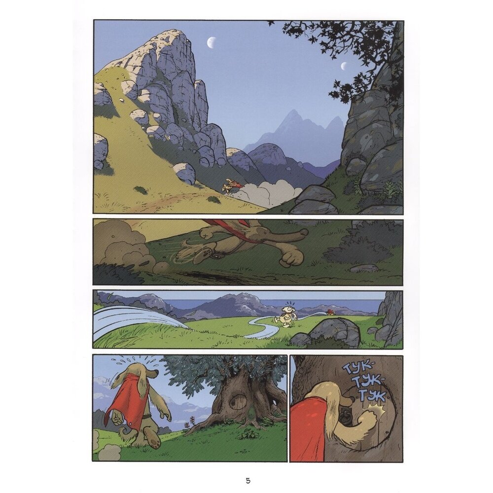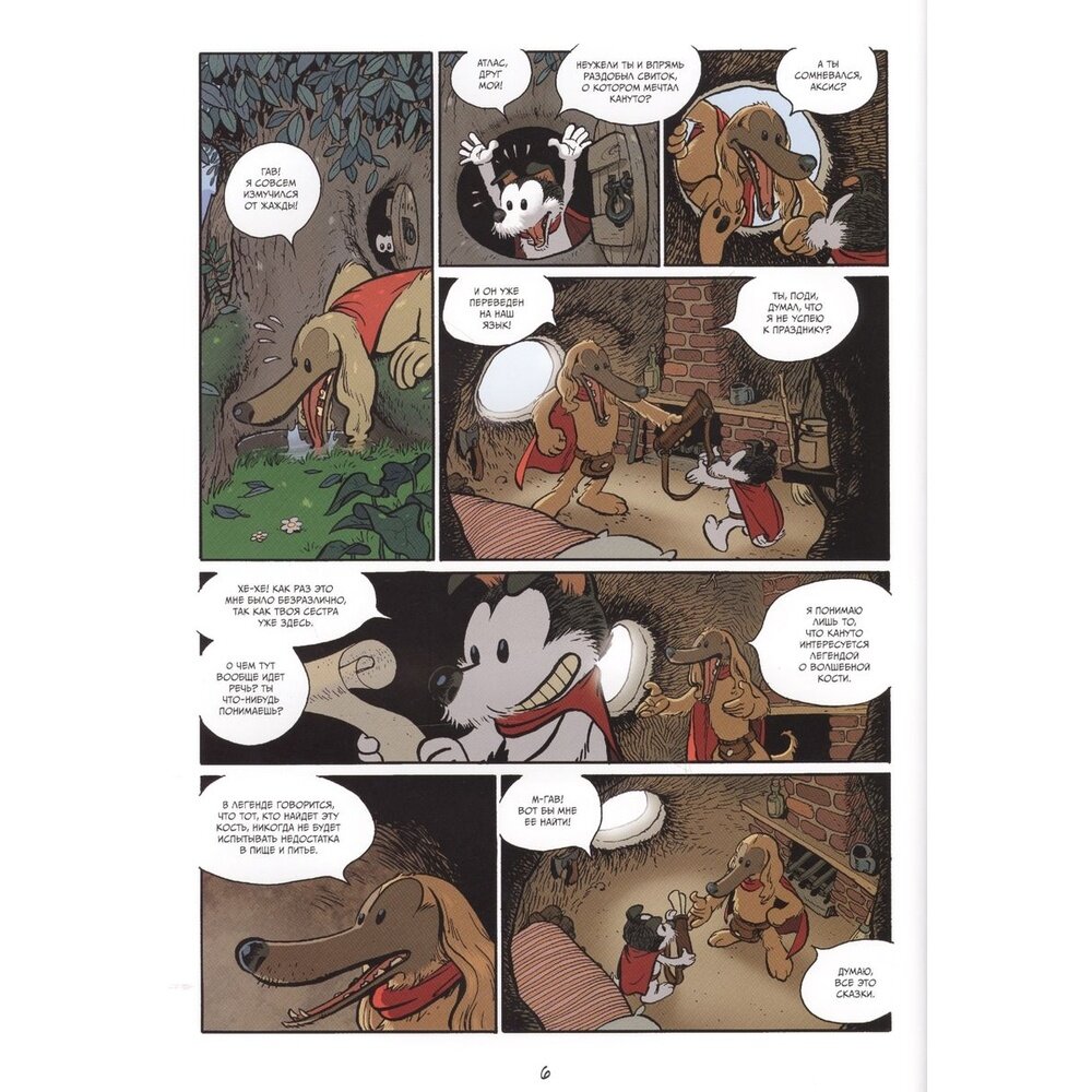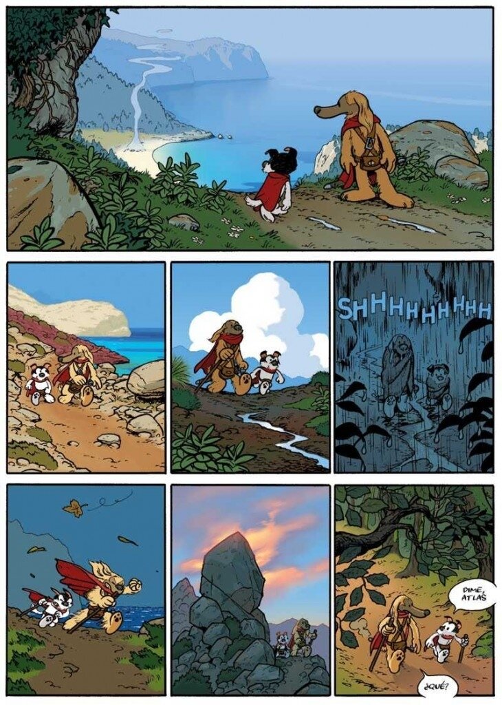 Очень часто писатели, художники, мультипликаторы и авторы комиксов наделяют своих любимых животных человеческим разумом и создают целые миры, очень похожие на наш в тот или иной период людской истории, но лишенные людей, место которых занимают мало чем отличающиеся от нас в плане поведения и быта кошки, мыши, утки, медведи и другие представители фауны. Созданный в стилистике «антропоморфной анимации» комикс испанского художника Пау рассказывает о приключениях двух собак (я не собачник, поэтому про их породы, увы, ничего сказать не могу), одну из которых зовут Атлас, а вторую, соответственно, Аксис. Место, в котором они живут, является «собачьей» копией Франции девятого века, время и место выдают одежда (да, животные здесь носят одежду), жизненный уклад, предметы быта и исторические события, из-за которых двум друзьям пришлось отправиться в опасное и долгое путешествие.
