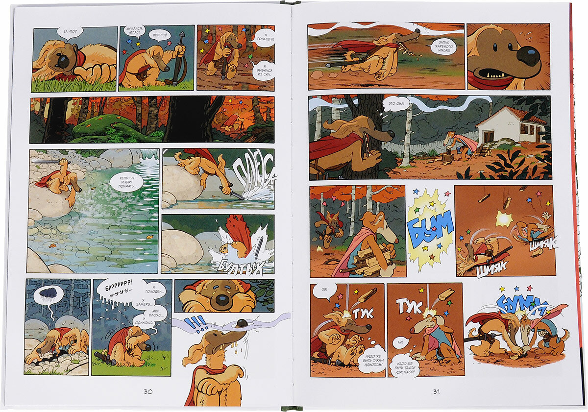 Начинается первый том саги с того, что Атлас приносит другу карту, в которой указано нахождение мифической Волшебной Кости, обладатель которой никогда не будет голодать. Но история о «собачьем Граале» отступает на второй план и совсем исчезает со страниц этой книги на фоне обстоятельств, куда как более жизненных и соответствующих той эпохе – на селение, где живут друзья, нападают захватчики с севера, дваряги (и тут отлично сработал переводчик), безжалостные варвары с длинной шерстью, приплывшие на чёрных, с красными парусами драккарах в компании с белыми медведями, выполняющими здесь роль берсеркеров. Собственно, нападение дварягов и привязывает события комикса к девятому веку, когда северные гости активно грабили Европу, почувствовав слабину Франкской империи. Но вернемся к комиксу: враги уничтожают деревню и уводят в плен сестру Атласа Эрику и её подругу, лисичку Рапосу. Придя на место битвы и проводив в последний путь погибших товарищей, Атлас и Аксис решают идти на север, вслед за дварягами, чтобы спасти девушек. Но как это сделать, если нападавшие оставили только застежку от плаща да один меч на двоих, которым никто из друзей и пользоваться-то не умеет? И тут пришло время вспомнить, что перед нами всё-таки собаки, и, как бы они не были похожи на людей, их животные навыки и привычки в комиксе выходят на первый план: друзья готовы идти по запаху, и мы можем наблюдать, как они обнюхивают фекалии врагов и несколько раз метят территорию как того требуют их инстинкты. А заодно Аксис ничего не может поделать с собой и, при виде овцы или козы (кстати, они тут тоже говорящие) бросается на неё с целью набить живот вкусным мясом. Этот его голод напоминает о «кабанчиковой зависимости» Обеликса, героя культовой серии французских комиксов, с которой работу Пау роднит антураж и эпоха, в которой происходит действие, и некоторые отсылки, с помощью которых испанец отдает дань уважения сериалу Альбера Удерзо и Рене Госсини. Но, в отличии от безобидной и остроумной классики, «Атлас и Аксис», являясь формально комиксом для детской и юношеской аудитории, содержит в себе достаточно жесткие сцены, которые изначально не ожидаешь от истории про двух собак. Здесь есть кровь, сцены поедания стервятниками павших воинов, а в конце герои, пройдя огромные расстояния, пережив разлуку и несколько интересных знакомств, одно из которых наверняка станет началом трепетной любовной истории, участвуют в настоящей бойне. И это «эпицентр» сюжета, который демонстрирует: персонажи данного комикса стремительно меняются под действием чрезвычайных обстоятельств