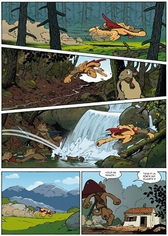 Впрочем, есть ещё одна выдающаяся серия комиксов, с которой работу Пау можно сравнить – это «Боун» Джеффа Смита. На это есть и визуальные намёки, и что-то в атмосфере комикса неуловимо намекает на то, что автор «Атласа и Аксиса» с белыми человечками, чей вид был вдохновлен формой телефонной трубки, знаком не понаслышке. Фанатам «Мышиной гвардии» тоже не стоит пропускать этот комикс, мрачновая реалистичность эти две работы, безусловно, роднит. Рисунок здесь красивый и яркий, очень реалистичные и детальные пасторальные пейзажи, герои симпатичные, каждый со своим прописанным характером, приключенческий и драматичный сюжет замечательно проработан – одним словом, это хороший европейский комикс, который стоит прочитать, правда, иногда он «обманывает» ожидания тех, кто готов увидеть в нём только «детскую сказку про собачек», некоторые сцены, повторюсь, вызывают бурю эмоций. На русском «Атласа и Аксиса» издала «Фабрика комиксов», книга вышла в твёрдом переплете, в ней также представлены самые ранние зарисовки художника, небольшой «подстрочный рассказ» о истории появления комикса, чёрно-белые эскизы страниц и несколько цветных рисунков. -