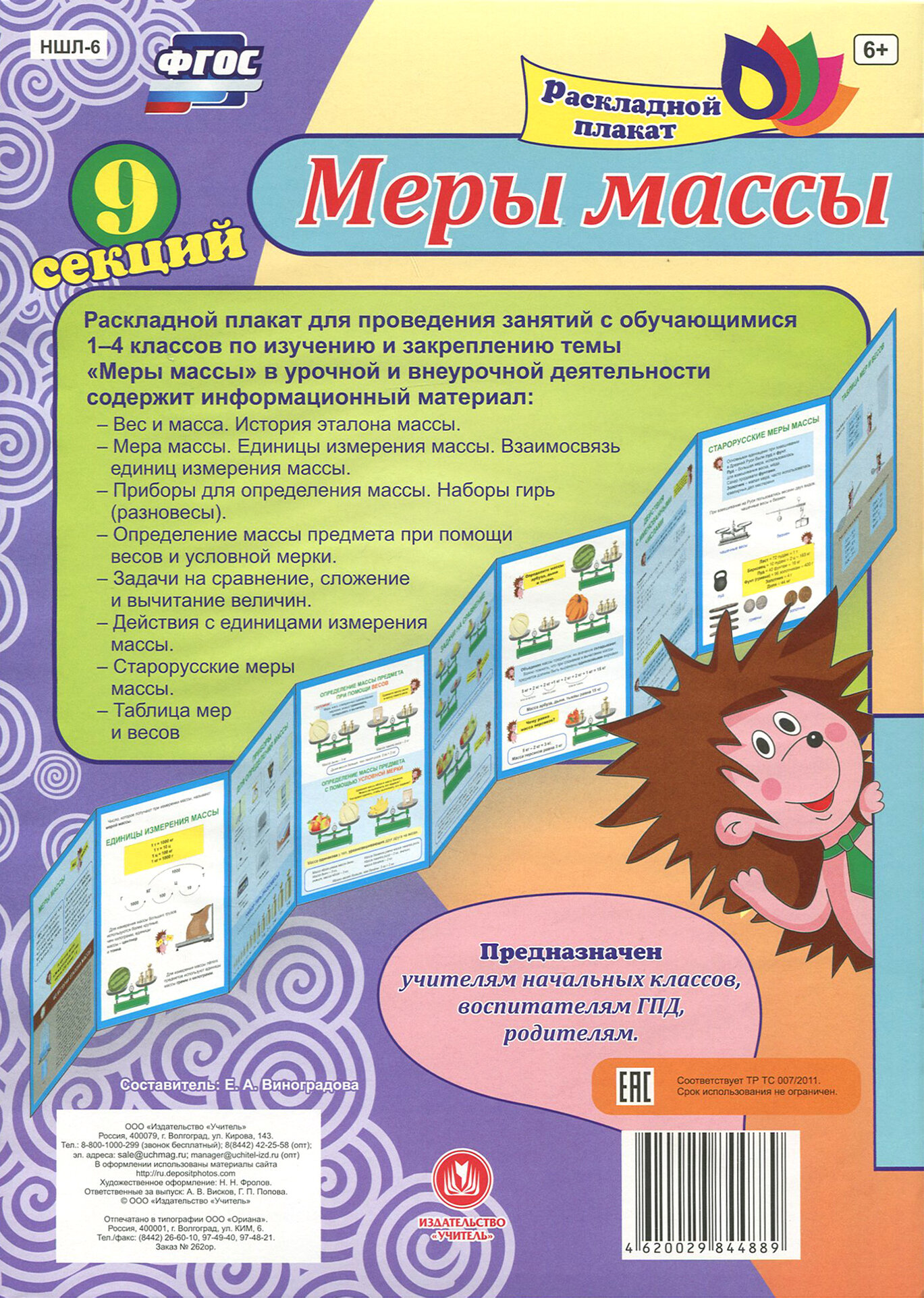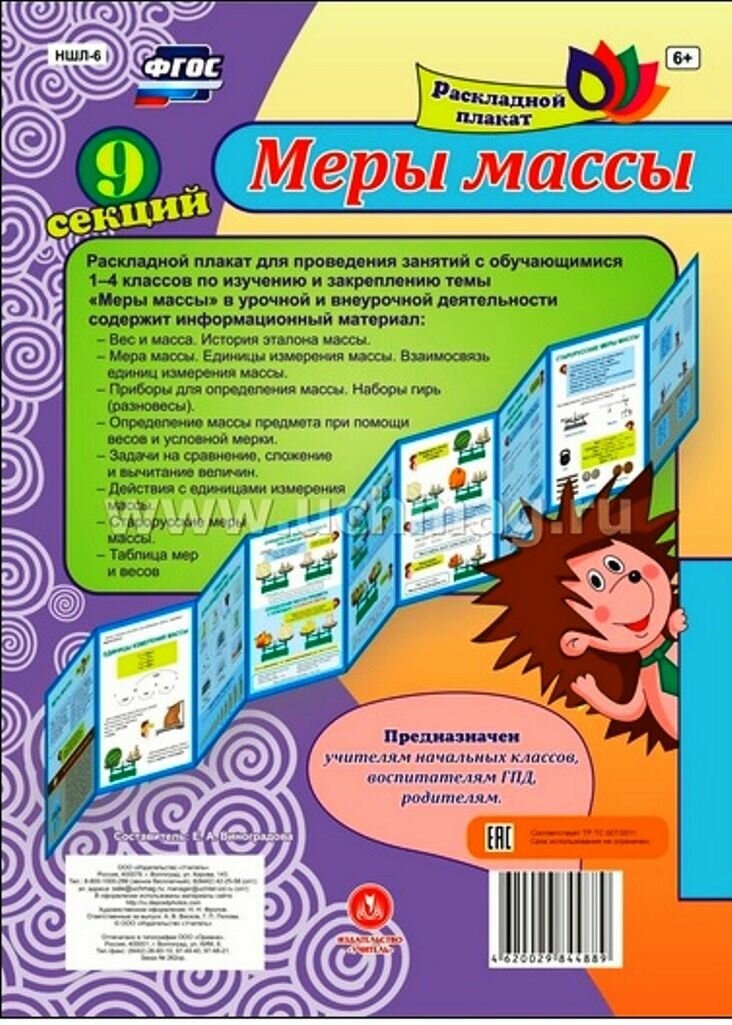 Раскладной плакат из 9 секций для организации и проведения занятий с обучающимися 1- 4 классов по изучению и закреплению темы "Меры массы" в урочной и внеурочной деятельности и содержит информационный материал: