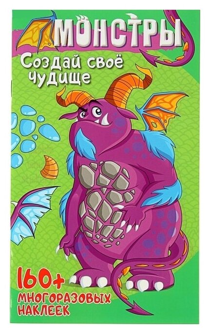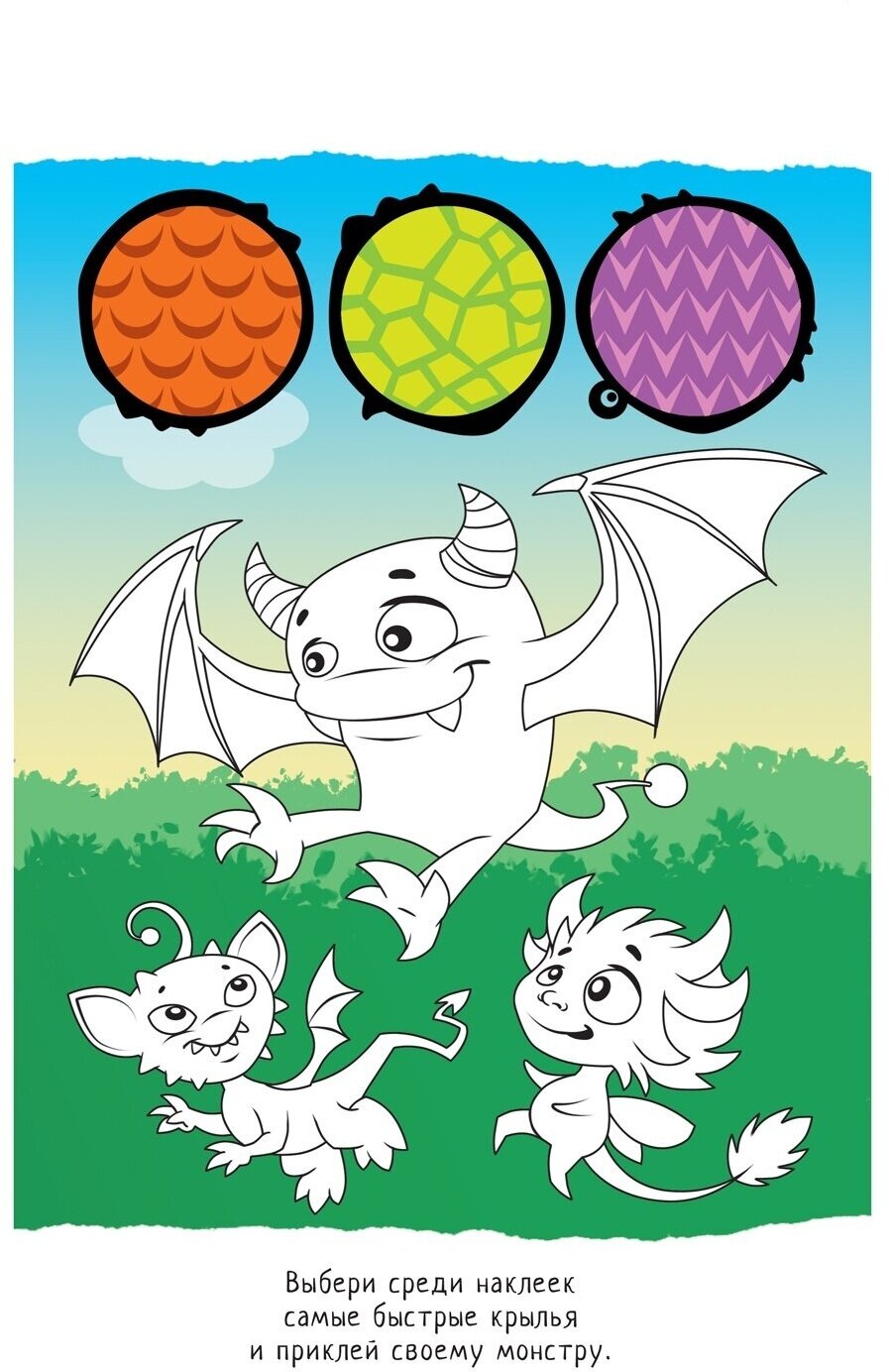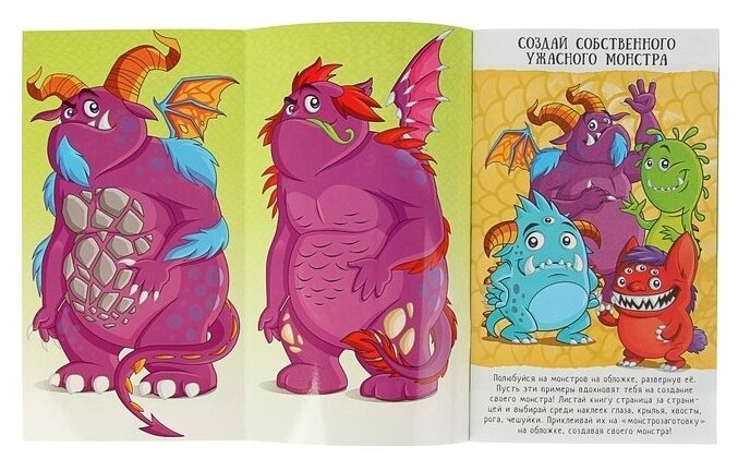 Создай собственного монстра на свой вкус. Разверни обложку, найди "заготовку" для будущего монстра и приклей ему глаза, крылья, зубы, волосы, когти, хвост и другие детали.