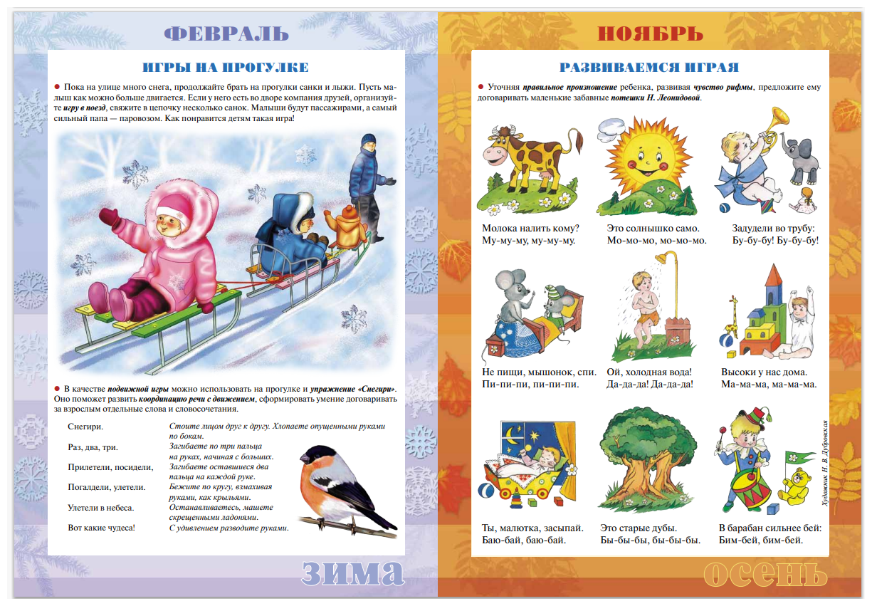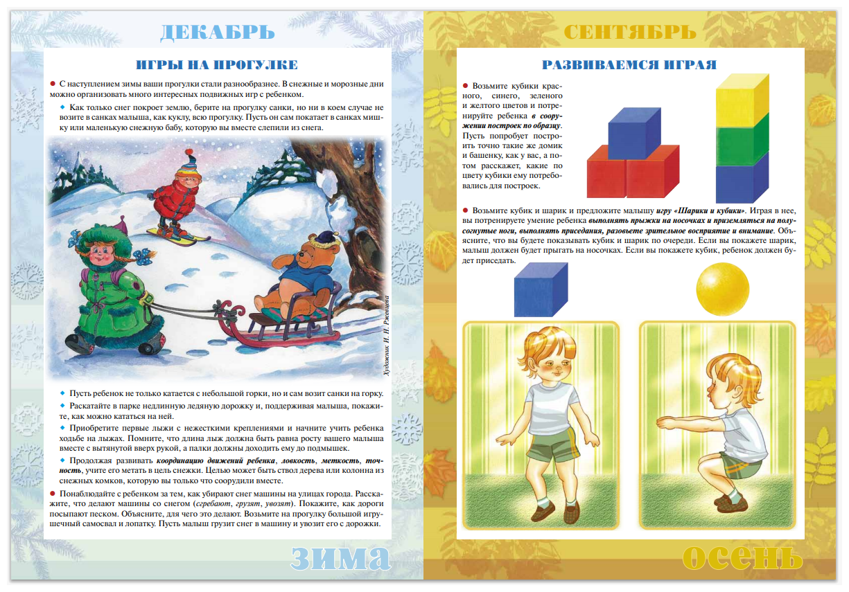 На каждый месяц года мы разработали по 4 странички с играми, упражнениями, рекомендациями. Отделите листы от обложки и разрежьте их. Получатся листовки, которые вы сможете компоновать в родительском уголке по своему усмотрению, повернув нужной стороной.