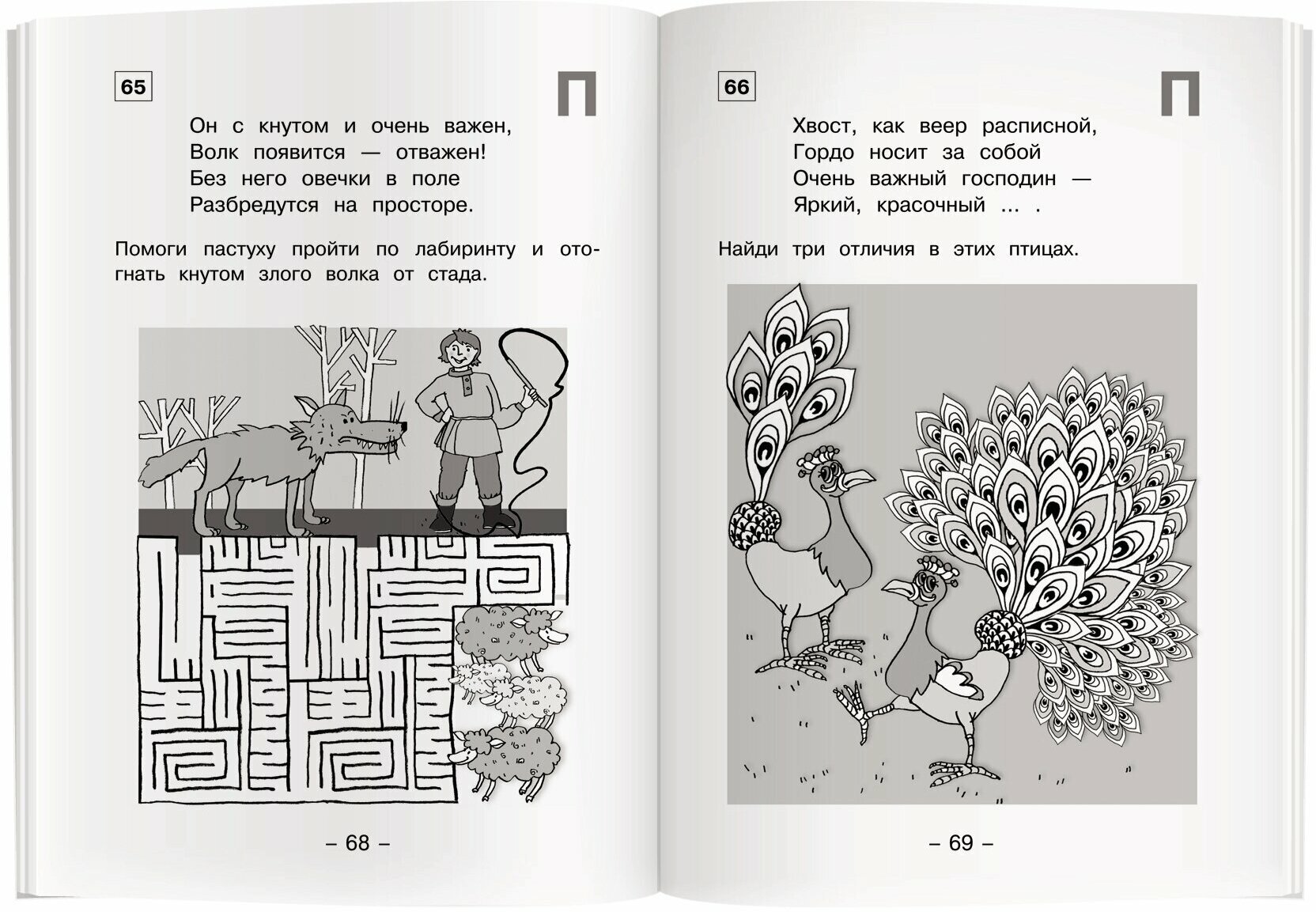 Автор книги «100 загадок от А до Я для детей 4-6 лет» Кодиненко Геннадий Федорович очень любит детей. Каких только подсказок к своим остроумным загадкам на все буквы русского алфавита он ни придумал! Тут и симметричное рисование, когда нужно дорисовать половину картинки; и частичное рисование - только тех элементов, которые отмечены определённым образом; и лабиринты, ведущие к правильному ответу; и рисование по точкам; и счёт предметов на картинке. Есть загадки, отгадав которые, ребёнок получает важные навыки обращения с потенциально опасными предметами: розеткой, спичками и т. п. Рисунки в книге почти чёрно-белые, но в данном случае это не огорчает: ведь их можно раскрасить, дорисовать, прочертить. Всё это для дела, потому что ведёт к отгадке.