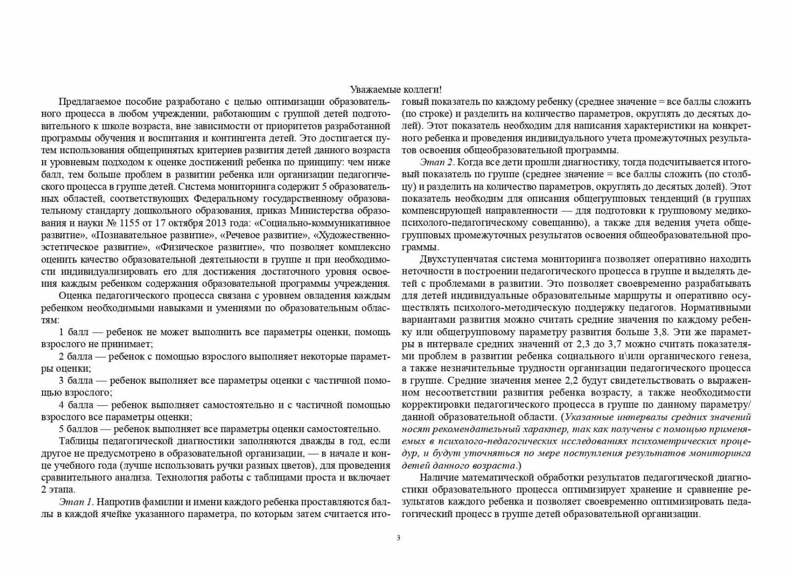 Предлагаемые параметры оценки для данного возраста общеприняты в психолого-педагогических исследованиях и подвергаются статистической обработке. Заполненные таблицы позволяют сделать качественный и количественный анализ развития конкретного ребенка и определить общегрупповую тенденцию развития детей 6—7 лет, что регламентировано п. 3.2.2. ФГОС ДО (Федеральный государственный образовательный стандарт дошкольного образования, приказ Министерства образования и науки №1155 от 17 октября 2013 года). Пособие адресовано заведующим, методистам и педагогам дошкольных образовательных учреждений общеразвивающей и компенсирующей направленности. Может быть интересно родителям, воспитывающих ребенка 6—7 лет, а также студентам психолого-педагогических специальностей.