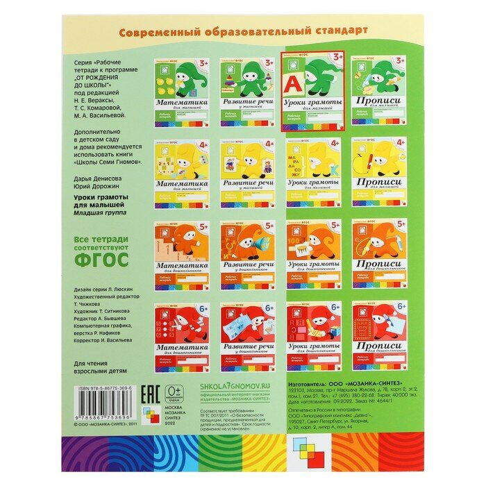 Сервис сравнения цен СкидкаГИД предлагает сравнить цены на товар «Книга: Уроки грамоты для малышей. Младшая группа. Рабочая тетрадь (Дарья Денисова, Дорожин Ю.); Мозаика-Синтез, 2022»