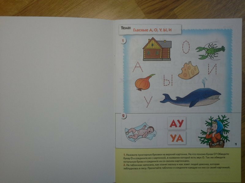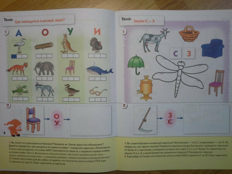 Выполняя задания из рабочей тетради, ребята повторяют уже знакомые им гласные звуки, учатся различать согласные, определять с какого звука начинается слово, знакомятся с твердыми и мягкими звуками. Детям предлагается разгадать загадки, ребусы, подобрать подписи к картинкам.