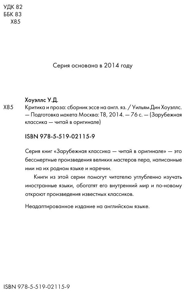 Серия книг "Зарубежная классика - читай в оригинале" - это бессмертные произведения великих мастеров пера, написанные ими на их родном языке и наречии.Книги из этой серии помогут читателю углубленно изучать иностранные языки, обогатят его внутренний мир и по-новому откроют произведения известных классиков.Сборник эссе Уильяма Дина Хоуэллса "Критика и проза" на английском языке, неадаптированное издание.Издательство T8Мягкий переплетОбъем - 76 стр.Формат - 148x210 мм.ISBN 978-5-519-02115-9Год издания: 2014