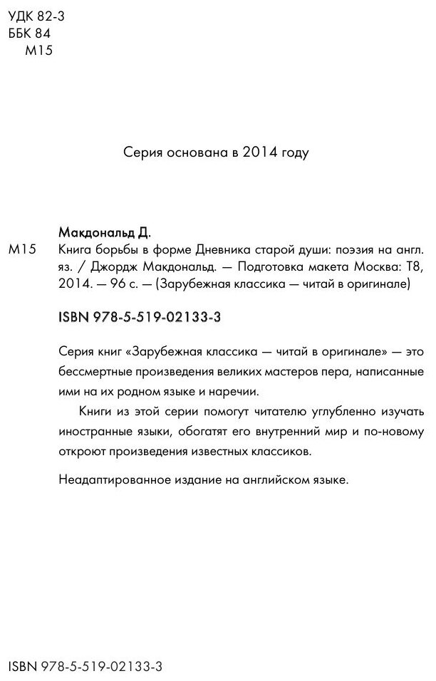 Серия книг «Зарубежная классика — читай в оригинале» — это бессмертные произведения великих мастеров пера, написанные ими на их родном языке и наречии. Книги из этой серии помогут читателю углубленно изучать иностранные языки, обогатят его внутренний мир и по-новому откроют произведения известных классиков.