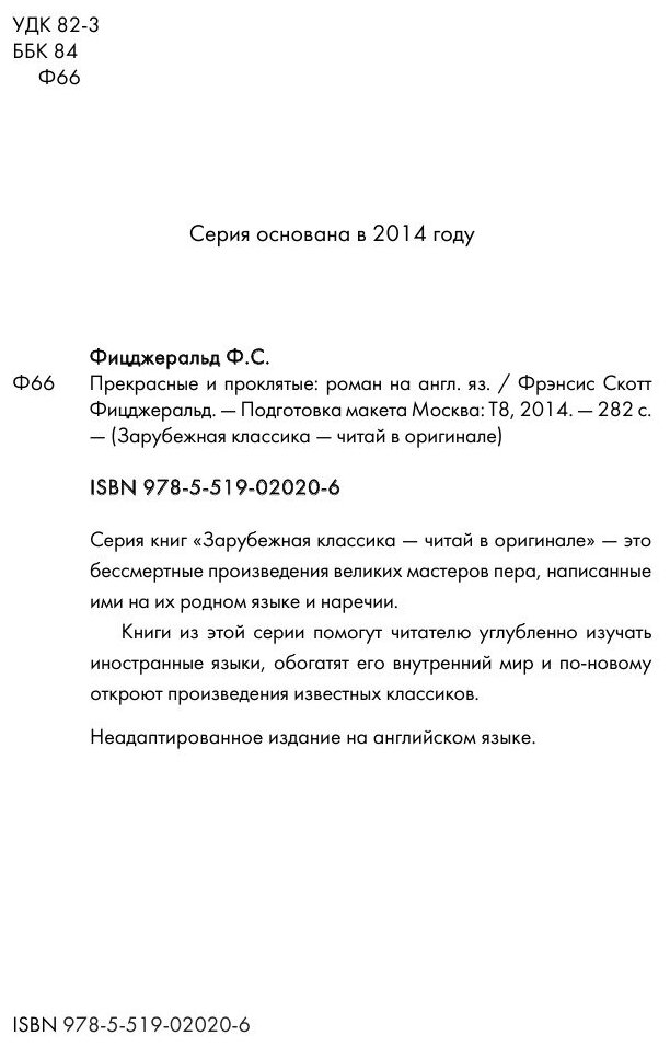 Всем, кто изучает английский язык, было бы полезно и интересно познакомиться с работами Ф.С.Фитцджеральда. Меня очень порадовало данное издание, в котором прекрасно всё: белоснежная, приятная на ощупь бумага; хорошо напечатанный, красивый шрифт, который легко читать; неадаптированный текст одного из самых значимых произведений писателя; приятный запах бумаги